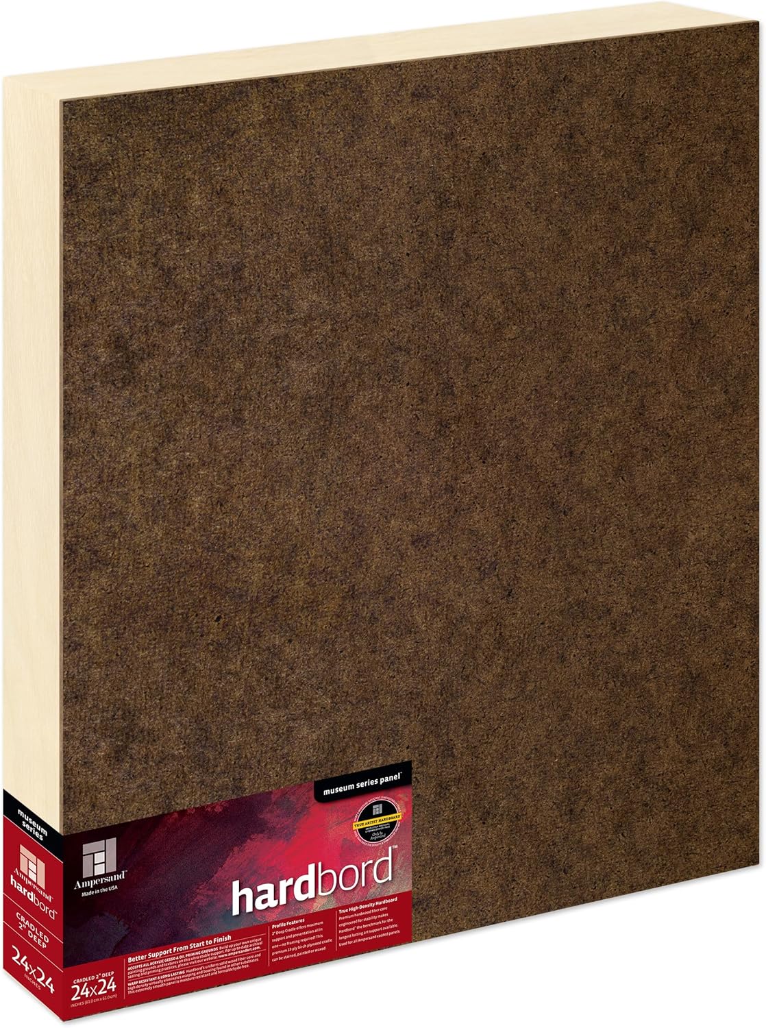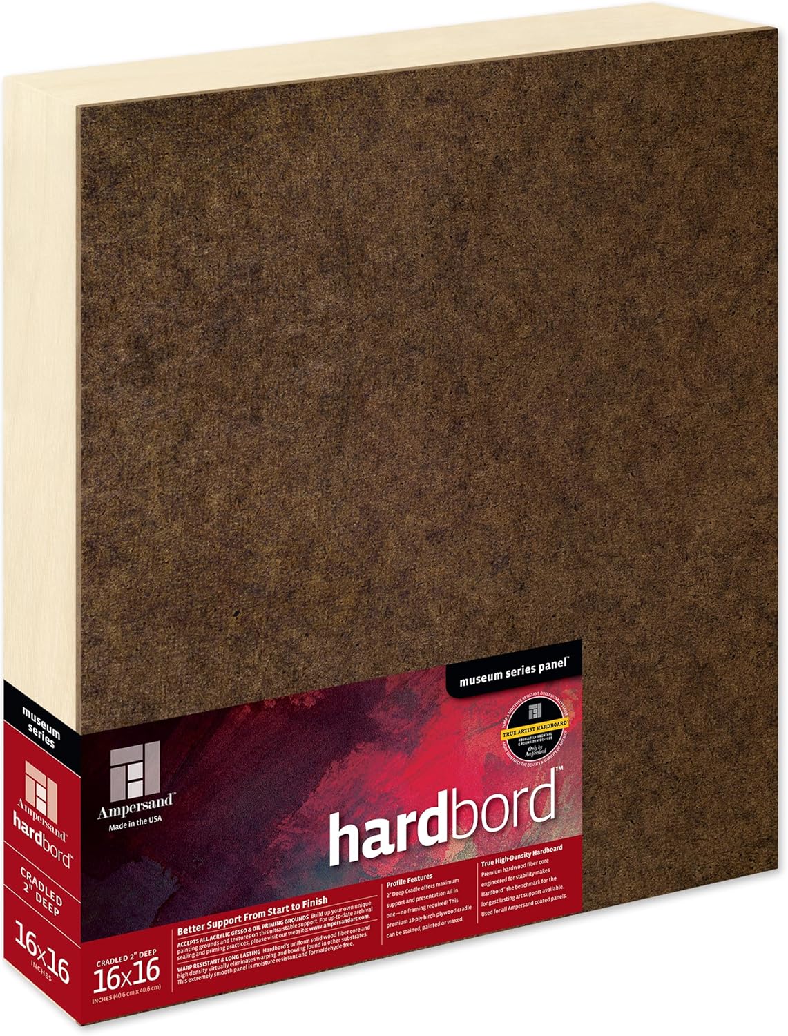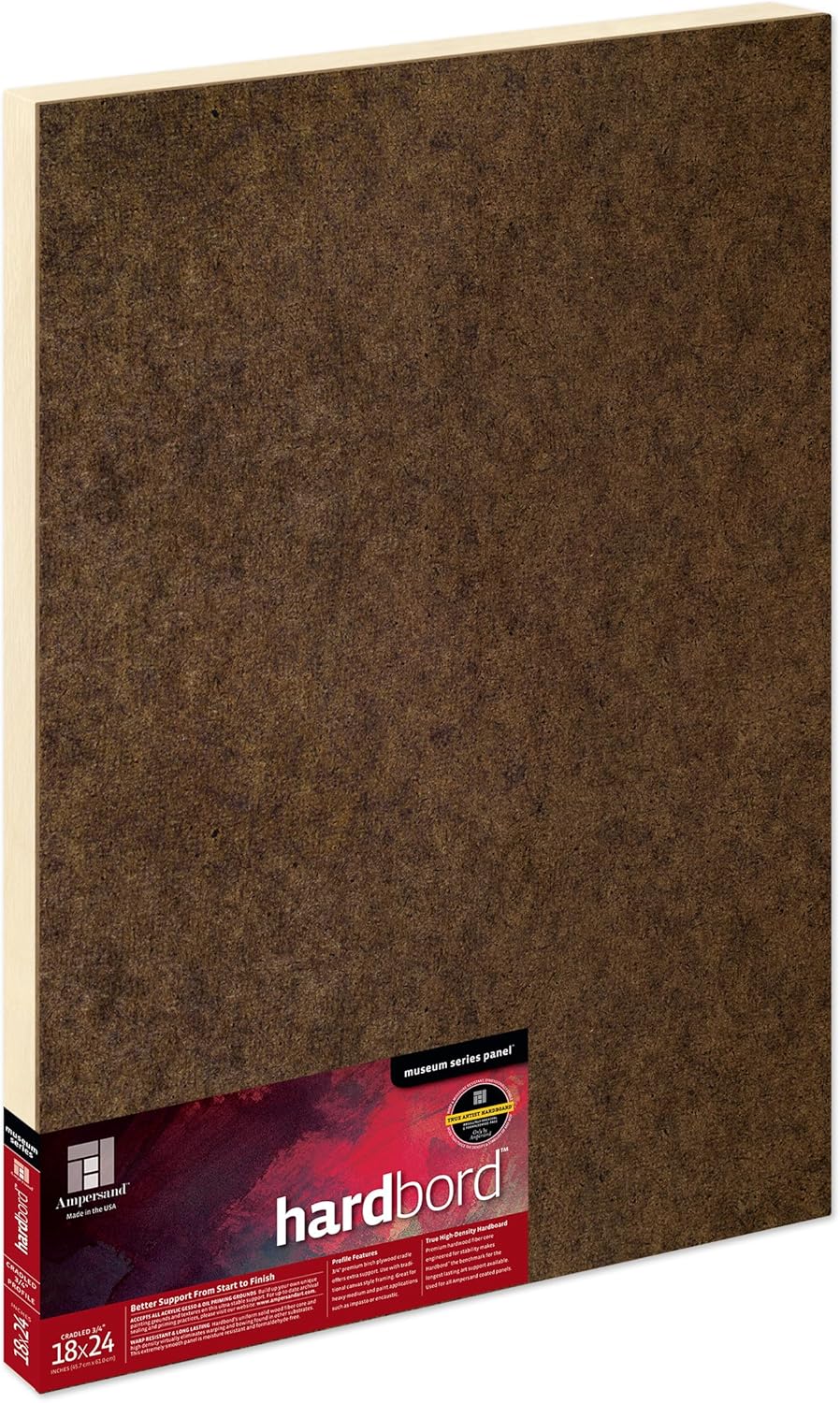Ampersand Art Supply's Museum Series Hardbord is the most stable substrate on the market for your artwork. Our premium, warp-resistant, FSC-Certified 1/8” Hardbord will ensure your artwork is supported to prevent damage from warping, bowing or movement - it is the choice substrate for all Ampersand Museum Series coated panels. A great alternative to canvas, Hardbord is perfectly suited for all acrylic gessoes, specialty grounds, traditional gesso, and oil primers and is also a perfect support to mount watercolor papers, photographs, fabrics, prints and more. Ampersand uses true high-density hardboard made from US-grown renewable and FSC Certified Aspen wood fibers and is made without formaldehyde or harmful VOC’s (volatile organic compounds) unlike other hardboards and MDF boards. Only Ampersand builds cradles by hand with premium-grade, 13-ply birch plywood for maximum stability and a clean, finished look from edge to edge. Choose from 3/4", 1 1/2" and 2" deep cradles, offering support and presentation all-in-one. All Ampersand Museum Series panels are eco-friendly, formaldehyde-free, and proudly handcrafted in the USA.