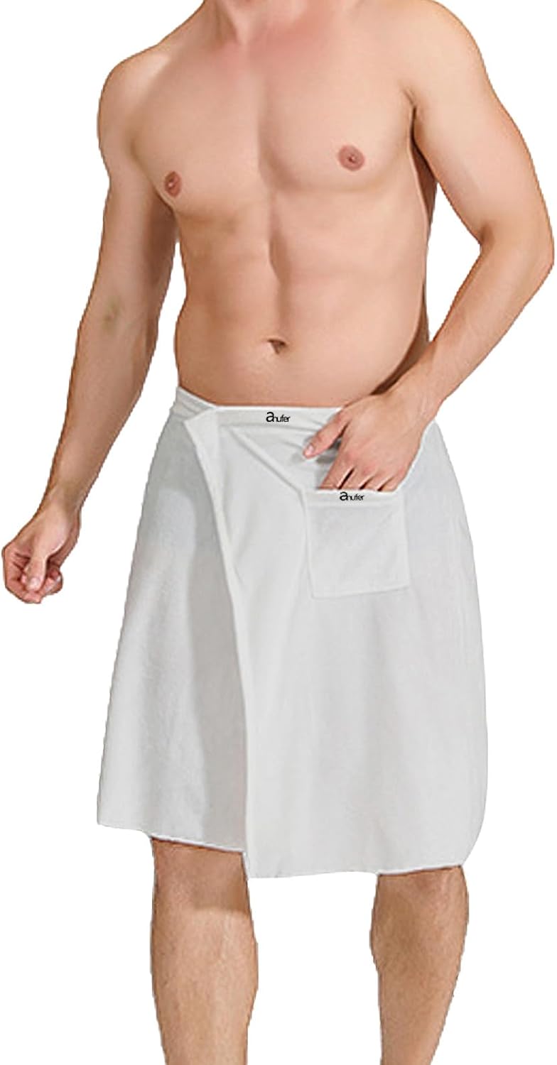 Mens Adjustable Bathing Towel Wrap with Pocket:* Material: 100% Coral Fleece. Skin-friendly and soft to skin, super absorbent, breathable and comfortable to wear.* Closure: Elastic waistband and hook & loop fastener.* Solid colors, practical front pocket, lightweight and portable.* Size: S, M, L. Length: 50cm/19.7"-60cm/23.6". Weight: 200g-250g. 5 colors for choice. * Multipul Uses: Ideal for shower and bath, sauna and spa, gym, pool, beach, travel, locker room, college dorms, bathroom. Machine washable.