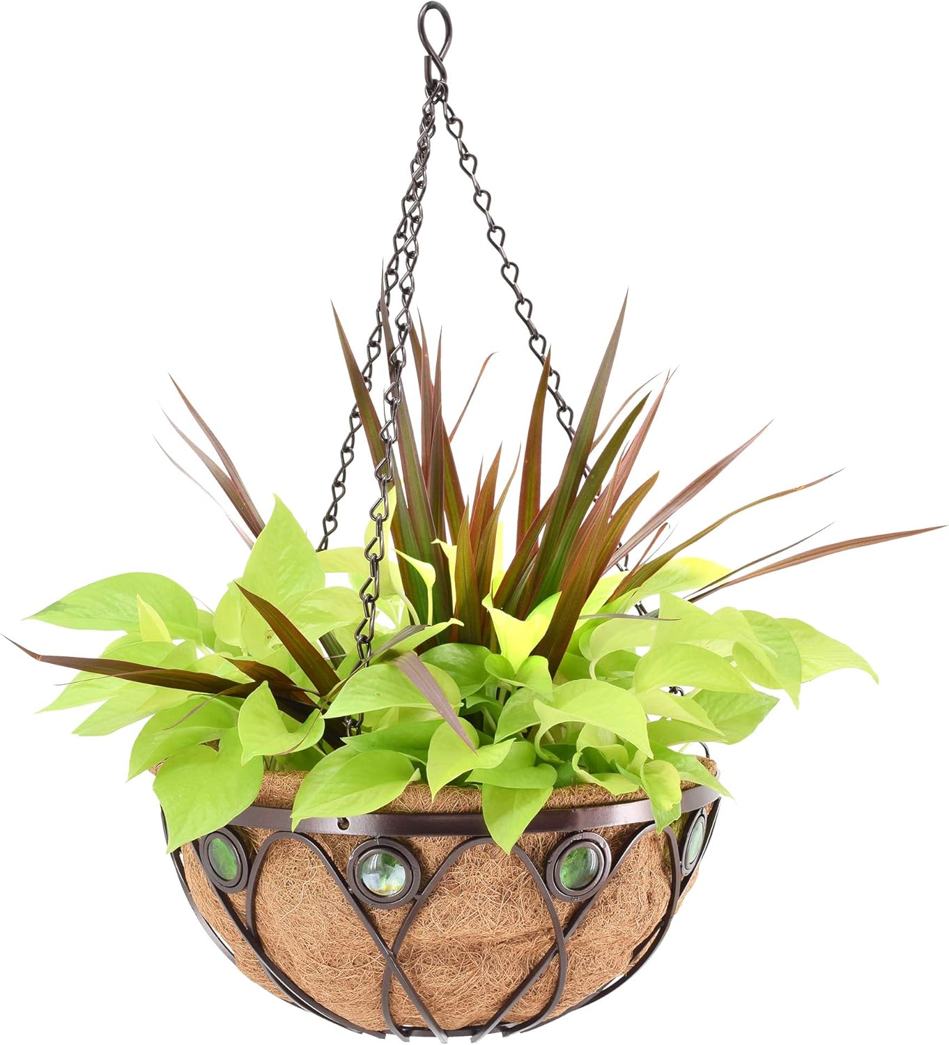Part of our long-established Emerald Series collection for coconut planters, this metal hanging planter basket from Arcadia Garden Products is a sure way to add style to your porch, patio or outdoor green space. The planter is weather-resistant and made from durable bronze metal. The flat, emerald green marbles featured within the metal scroll-work circles appear the entire circumference of the basket. This stylish hanging planter includes a secured coconut liner made from 100% natural coconut fibers. The liner helps retain moisture for promoting root growth while also providing sufficient drainage and air circulation. Simply add the right potting soil and the desired flowers, plants or combination. Three sizes are available to suit your needs, and replacement liners are available. A metal chain is attached to the hanging planter and the included closed S-hook at the top makes installment easy.