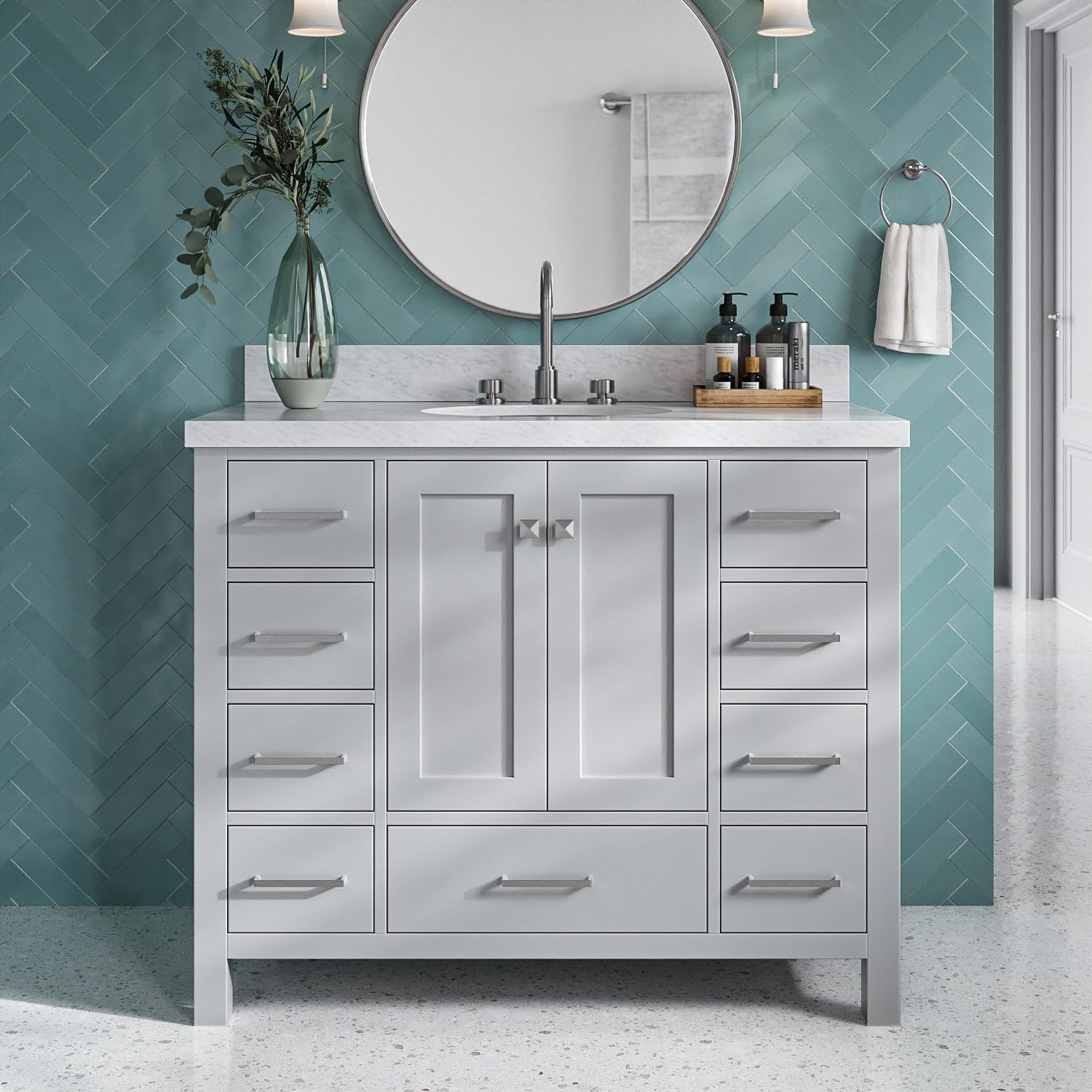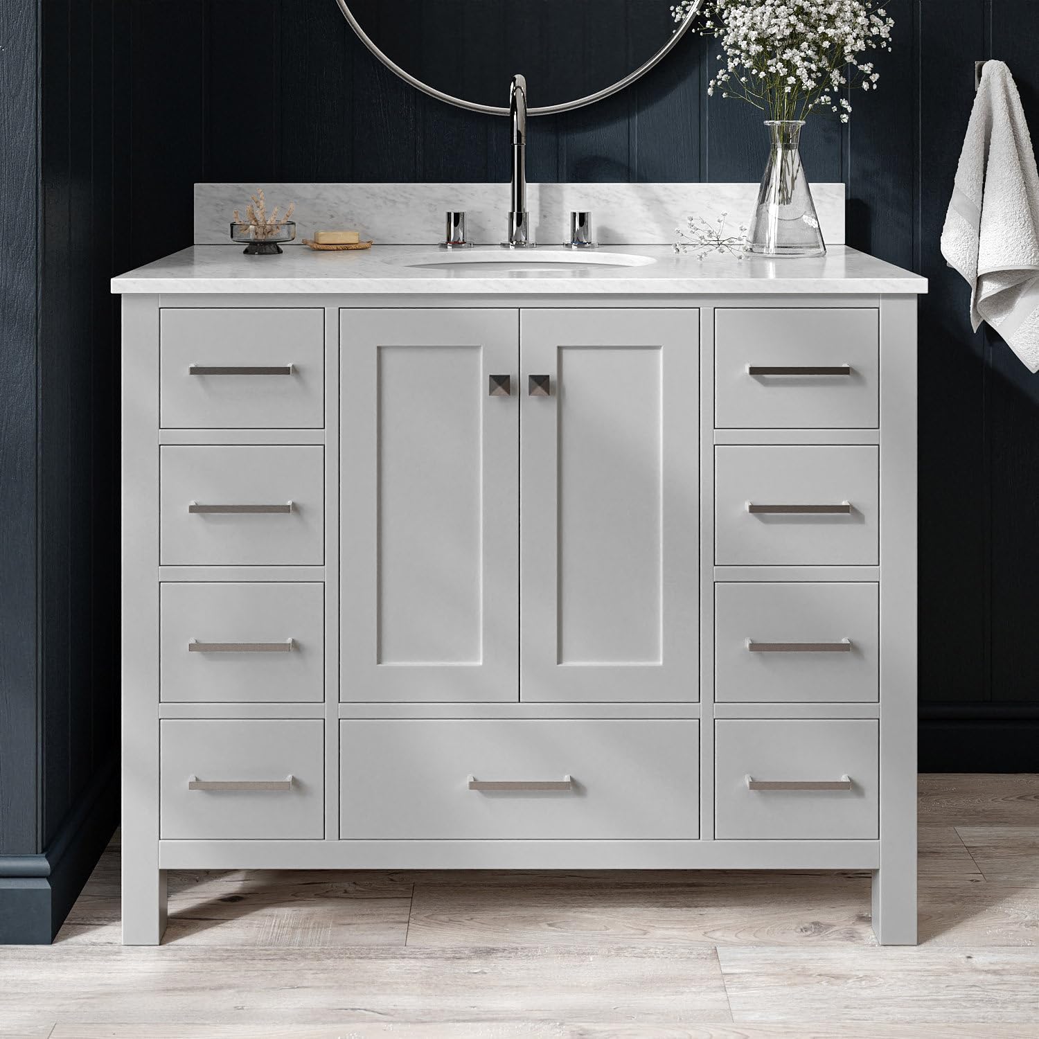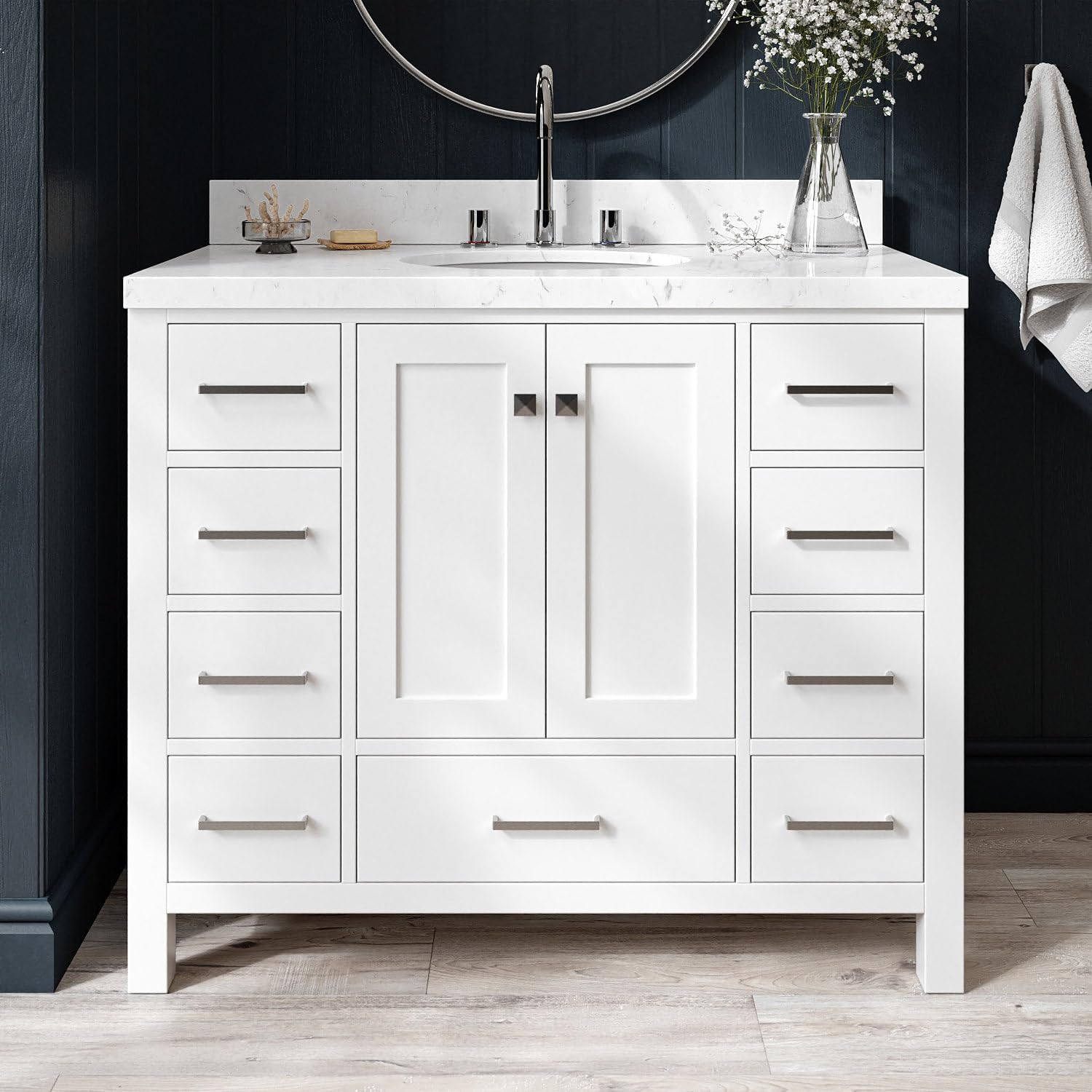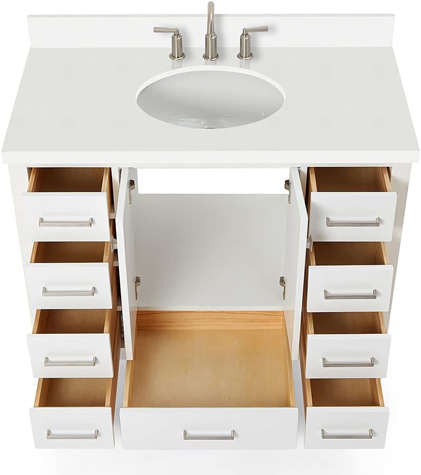 | Additional Features | 3-Year Limited Warranty, 1.5-Inch Mitered Edge Stain and Scratch Resistant Pure White Quartz Countertop, Solid Hardwood Bathroom Vanity Construction, Premium Sherwin Williams Painting Process, Soft Closing Doors & Drawers, Solid Wood Dovetail Drawer Boxes, No MDF, Staples or Dowels, Adjustable Hinges, Predrilled Countertop For 3-Hole Faucet-8" Inch Wide Spread. Faucets, drain, lights, and mirror are not included, allowing you to fully customize to your style and preference. |