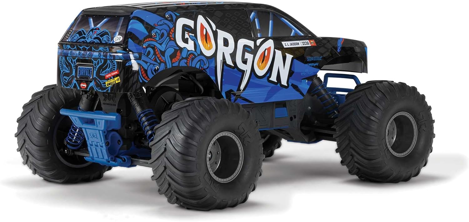 FeaturesARRMA amplified bashing at its most affordable priceFactory-built and ready-to-run — just add a battery and chargerFast and tough, with attention-grabbing styleDurable, brushless ready drive lineHigh-quality, LiPo-compatible Spektrum electronicsFull ball bearings — no plastic or metal bushingsHidden body mounting to preserve the awesome looksBottom-loading battery tray for easy battery changesSpektrum S660 waterproof digital steering servoSpektrum waterproof SLT 2-in-1 ESC/receiver unitSpektrum SLT2 2-channel 2.4GHz transmitter2-Year limited warranty (see website support for details)OverviewThe 1/10 scale GORGON™ MT is a low-cost monster truck that has everything you expect from an ARRMA® RC — unstoppable toughness, amped-up attitude, and performance capabilities that seem to have no end. This fully assembled, ready-to-run version adds one more advantage that any basher with experience will appreciate: The battery and charger choices are left up to you. Complete your GORGON MT with any compatible battery type and capacity with IC3/EC3 connectors that you prefer. Make it an even more affordable addition to your RC fleet by using a battery and charger you already own!However you complete it, the GORGON MT is designed to make you the center of attention wherever you bash. Straight out of the box, its strikingly original looks draw a crowd. The body comes factory-finished in blue, with color-coordinated shock springs, battery tray, skid plates, and front and rear bumpers that resist impacts and help protect those "fang-tastic" graphics. Go ahead and send it over punishing tracks. Proven ARRMA engineering gives the composite chassis bash-it-all durability