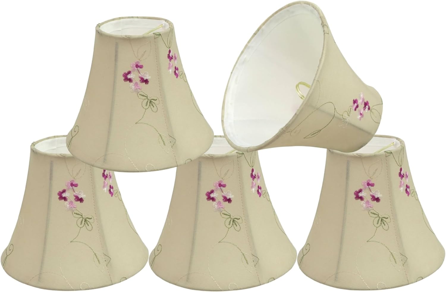 Aspen Creative Item #30054-9 Aspen Creative offers a 9-pack bell shaped clip-on lamp shade in light grey that will enhance any space. Shade Dimensions: 3" Top x 6" Bottom x 5" Height The shade is made with a clip-on styled fitter that is most compatible with torpedo chandelier light bulbs but can also be used with other bulbs that are similar in size. Clip-on style fitter designed for bare bulb chandeliers and wall sconces that use candelabra bulbs with an E12 base and 40 watt max, bent tip style bulbs not recommended (bulbs not included).Crafted with precision and attention to detail, our lamp shades are made with high-quality materials that are built to last. They are made to withstand daily use while still maintaining their shape and beauty. This product is suitable for a wide range of lighting options including small table lamps, accent lamps, candle stick lamps, chandeliers, and wall sconces, and bedroom night light lamps.