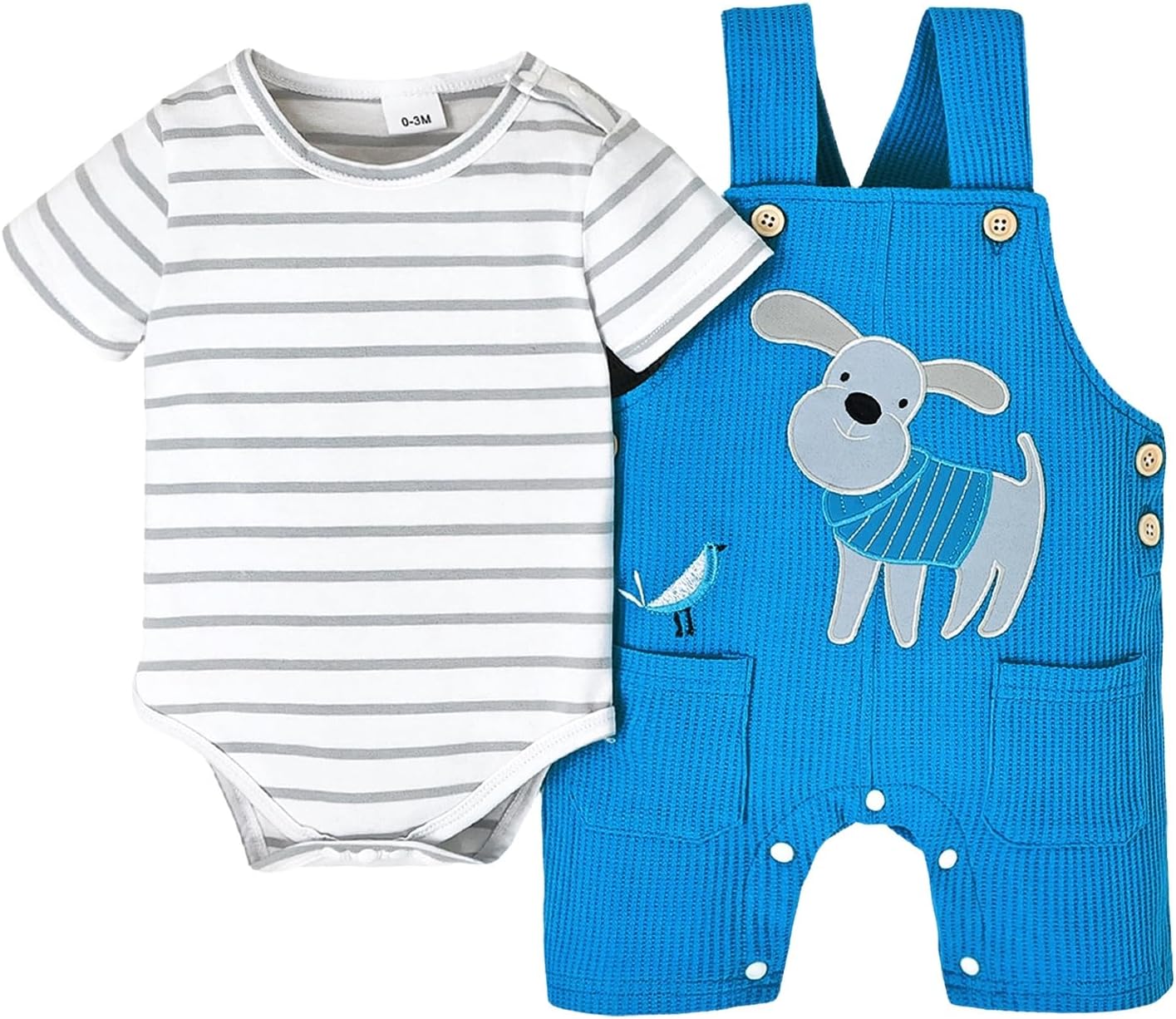 "✈OUR MISSION ◕‿◕CETEPY BRAND IS PURSUING SUPER TOP-NOTCH QUALITY STANDARDS TO BETTER PROTECT YOUR BABY'S SOFT TENDER SKIN. ✈CHARACTERISTIC: MATERIAL: Upper: 95% Cotton, 5% Spandex. Lower: 100% Polyester. This adorable baby romper and suspender shorts set is made from high-quality fabrics that perfectly combine comfort and style. The upper part is crafted from cotton and spandex, offering a soft, breathable, and elastic material that's gentle on your baby's delicate skin. The lower part is made from polyester, ensuring durability and strength to withstand active play and multiple washes. The romper features a trendy striped pattern and convenient snap buttons, making diaper changes quick and easy. The suspender shorts are decorated with a playful dog cartoon print, functional pockets, and button embellishments, adding both fun and practicality to your baby's outfit. This outfit is perfect for a variety of occasions, including birthday parties, holiday events, and family gatherings, making your little one the center of attention. It also makes a thoughtful gift for special celebrations such as Easter, birthdays, Day, Mothers Day, and other memorable moments. Ideal for gifting or personal use! ✈SIZE CHART Baby Boy Clothes 0-3 Months Length: 14.57" --- Bust: 18.11" --- Pants Length: 17.72" --- Size Tag: 0-3M Baby Boy Clothes 3-6 Months Length: 15.35" --- Bust: 18.9" --- Pants Length: 18.5" --- Size Tag: 3-6M Baby Boy Clothes 6-9 Months Length: 16.14" --- Bust: 19.69" --- Pants Length: 19.29" --- Size Tag: 6-9M Baby Boy Clothes 9-12 Months Length: 16.93" --- Bust: 20.47" --- Pants Length: 20.08" --- Size Tag: 9-12M Baby Boy Clothes 12-18 Months Length: 17.72" --- Bust: 21.26" --- Pants Length: 20.87" --- Size Tag: 12-18M ✈PACKAGE INCLUDED 1 x Baby Short Sleeve Striped Romper + 1 x Baby Cartoon Dog Overall Shorts."