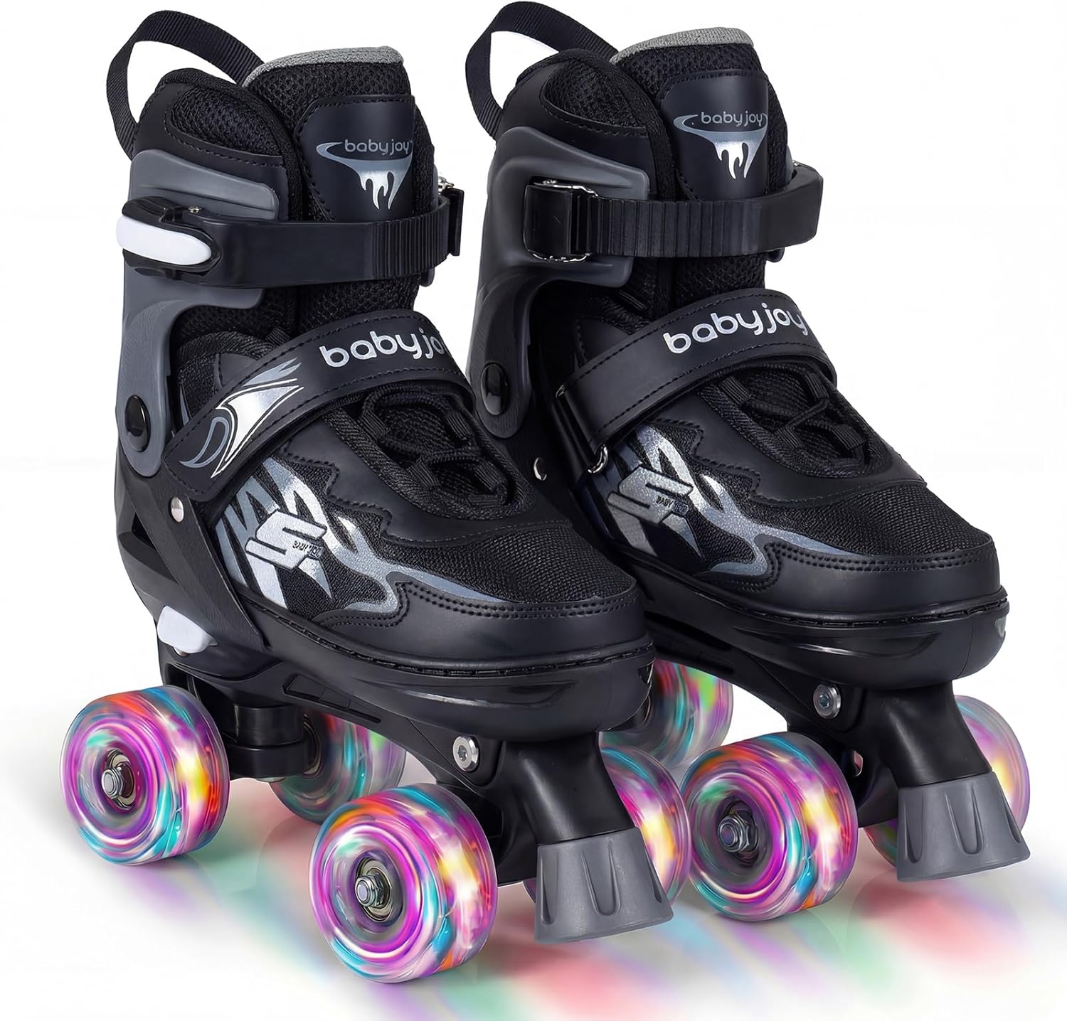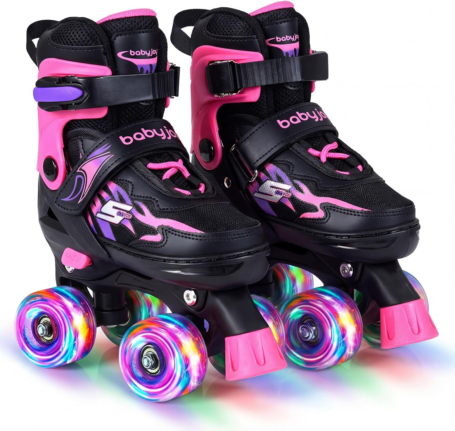 Description:Add more fun and movement to your child’s day with these comfortable roller skates.Crafted with breathable mesh fabric and a cozy interior, these roller skates provide lasting comfort and airflow for extended play. The smooth-gliding PU wheels and precision ABEC-7 bearings help young skaters maintain balance and control. A convenient push-button size adjustment allows the skates to grow alongside your child, ensuring a secure fit through different stages. For added peace of mind, the reliable buckles, hook and loop fasteners, and upgraded brake system work together to enhance safety. Finished with motion-activated light-up wheels and stylish accents, these roller skates turn every outing into a fun and memorable experience.Features:4-size adjustable design to grow with kidsMotion-activated light-up wheels for added excitement without batteries82A PU wheels absorb shock and resist wear for smoother skatingABEC-7 bearings provide stable rolling performanceBrake system for better stopping control and safetySecure laces and adjustable buckles for improved ankle supportBreathable mesh liner helps keep feet comfortable during long sessionsSoft padded interior enhances comfort for beginnersStylish pattern details add visual appeal and funIdeal gift choice that helps improve balance and coordinationEasy size adjustment system for quick fitting changesSpecifications:Color: Black/Blue/PinkMaterial: PP, PVC, PU, TPR, EVA, PE, Fabric, SpongeSmallProduct Sizes: 11C-1 (US), 30-33 (EU), 185-210 mm (CN)Recommended Age: 5-7Net Weight: 4.5 lbsMediumProduct Sizes: 2-5(US), 34-37 (EU), 215-240 mm (CN)Recommended Age: 7-9Net Weight: 4.5 lbsLargeProduct Sizes: 6-9(US), 38-41 (EU), 245-270 mm (CN)Recommended Age: 9-14Net Weight: 5.5 lbsPackage Included:1 x Roller Skate1 x Instruction