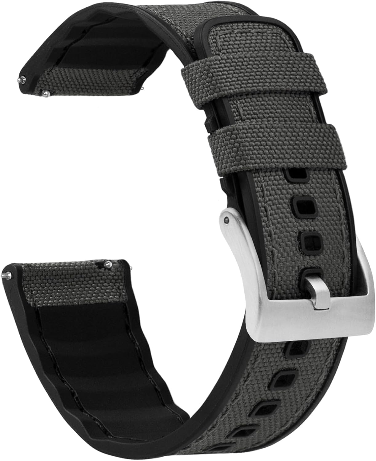 Cordura Fabric and Silicone Watch Band offers the best of both worlds. Engineered to be 100% waterproof, the band is perfect for year-round-wear, no matter your location. We’ve opted for the best, partnering with CORDURA brand fabrics, recognized for their long-lasting durability, resistance to abrasions, and waterproof technology. Thanks to the flexible, high tensile silicone base and the 316L stainless steel hardware, the comfortable fit that keeps you coming back to BARTON prevailsFeaturing silicone-lined eyelets, premium nylon stitching, and a locking keeper loop, this band is ready for action -- Whether you’re headed to a backyard BBQ or hike through Big Bend, we’ve got you covered.Swap in Seconds: Integrated quick release spring barsMaterial: Cordura Fabric and SiliconeHardware: 316L stainless steel or black PVDSizing: Standard length fits wrists 5" to 8"Band Width: 22mm(20mm at buckle), 20mm (18mm at buckle), 18mm (16mm at buckle)At BARTON Watch Bands, we obsess over designing quality products that meet the highest standard for fashion, function and fit. Based in the heart of Austin, Texas, BARTON was founded in the wake of many years of frustration with poorly designed, dysfunctional, low-quality watch bands. All of our bands are designed to be swapped in and out in a few seconds and without tools! Time to "Switch it Up" and let the fun begin....trust us, it's pretty awesome!
