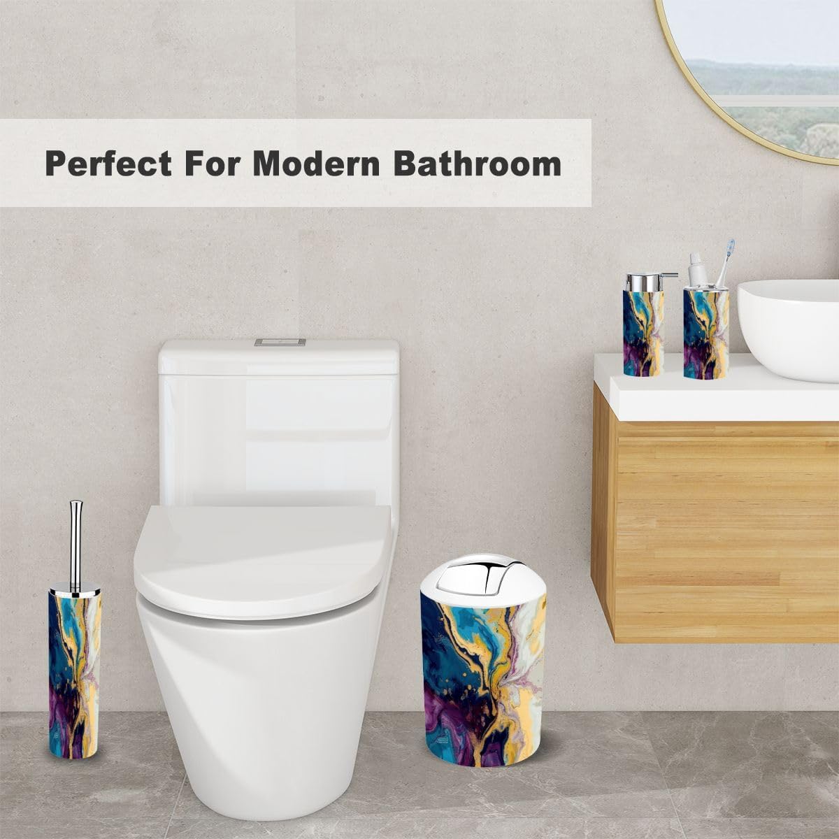 - Lotion DispenserIt can be pressed by one hand and rebound automatically. Use our soap dispenser for liquid hand soap, dish soap, lotion, shampoo, body wash, massage oils, etc.- Toothbrush Cup- Toothbrush HolderFits most sizes of toothbrushes, toothpaste, etc.- Trash CanWith swing lid, it's convenient for using.- Toilet Brush HolderHide the brush head inside the base- Soap DishIt can leak and keep dry.Please Note:1. Please allow tiny size difference for manual measurement.2. Please confirm the size before purchase.