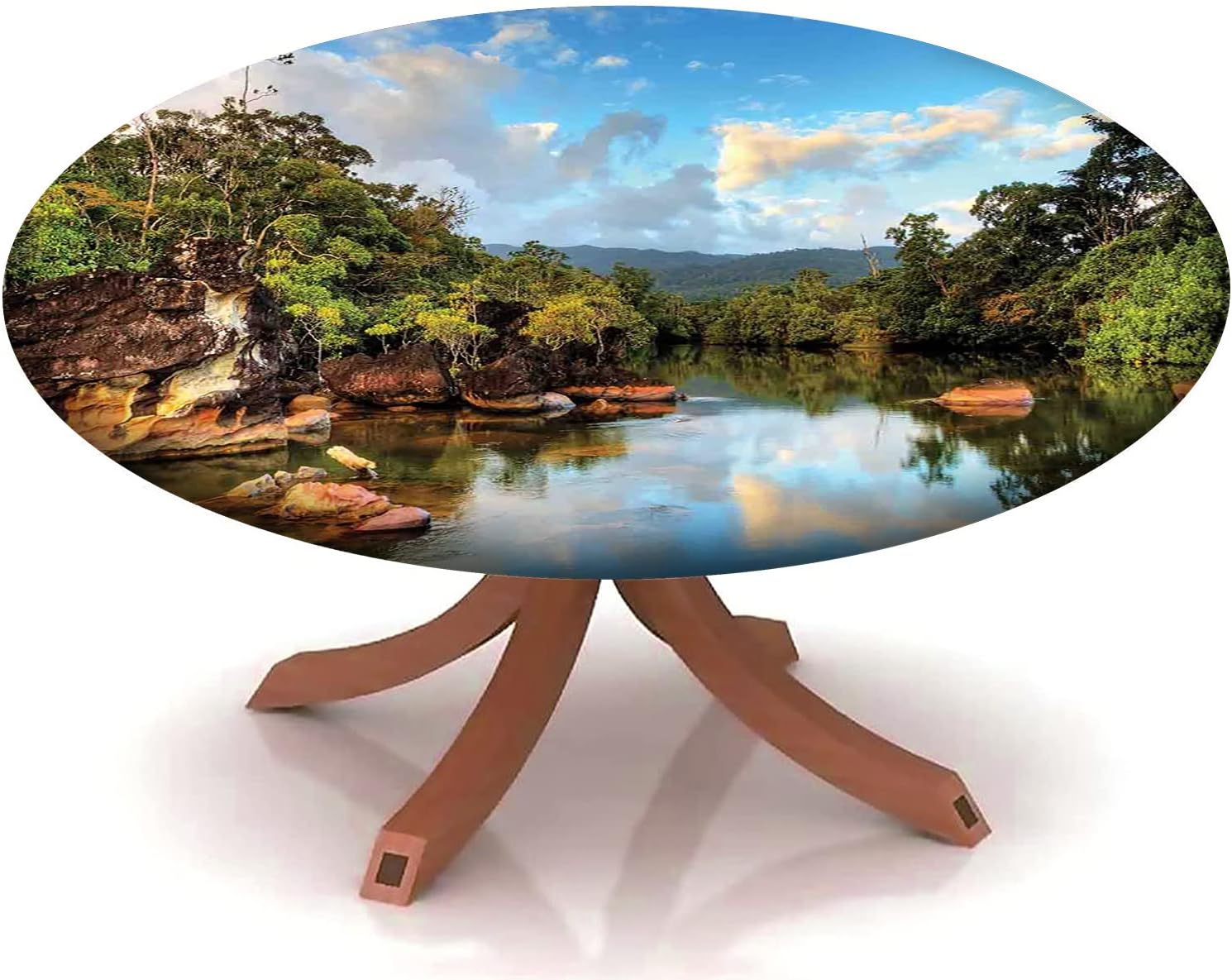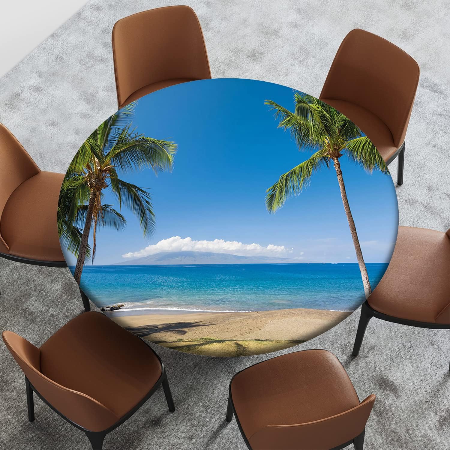 Beach Pattern Round Fitted Tablecloth,Elastic Edge,Suitable for Catering and Kitchen Can Wipe Dining Round Table coverr,Blue Brown,for 57" to 68" Round Tables
