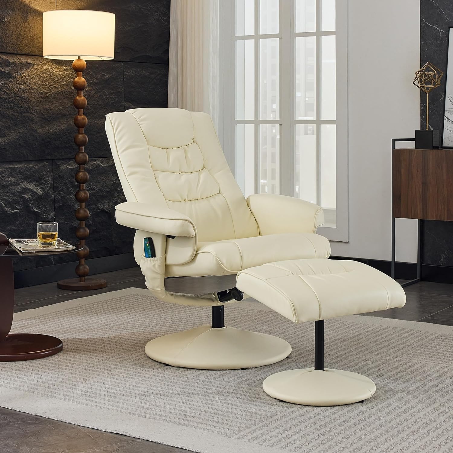 Experience ultimate comfort with this beige swivel recliner with ottoman, featuring a luxurious PU leather finish and high-density foam cushioning. The stress less reclining chair with ottoman offers 360° rotation and a 140° adjustable backrest for personalized relaxation. Enjoy a built-in massage system with 5 vibration modes, lumbar and back support, and a heated seat, perfect for living room, office, or home theater. The reclining chair with ottoman includes a sturdy plywood and iron frame for lasting durability, while pads ensure safety. Compact yet spacious, dimensions are 30.31"W x 30.12"D x 42.91"H (upright) and ottoman 19.69"W x 18.5"D x 17.52"H. Spot-cleanable PU leather maintains a fresh, stylish look effortlessly.