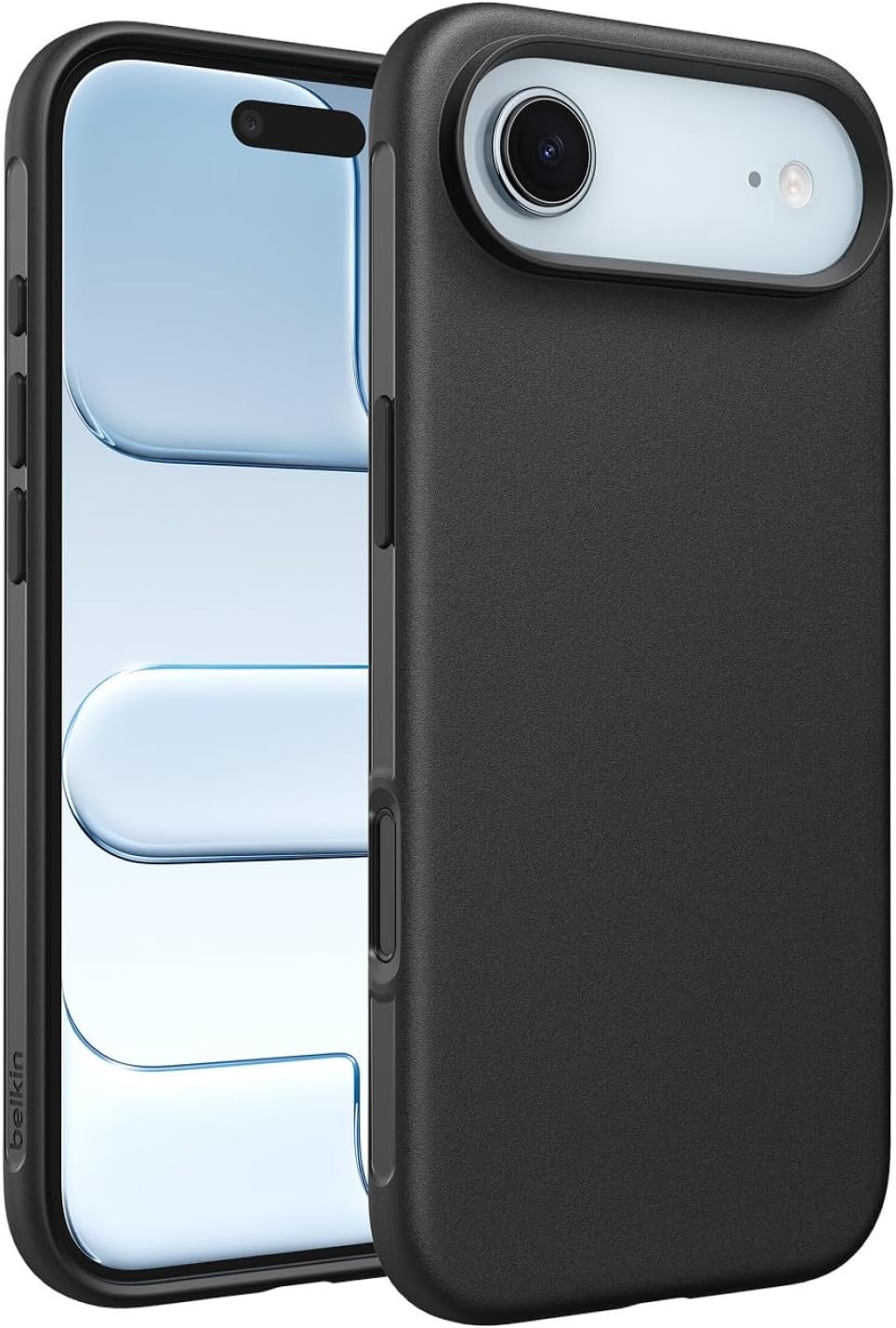 Defend your iPhone with the SheerForce Protect Series. The dual layer design offers dependable durability in a sleek and modern style. It protects from up to 13 ft./4-meter drops* while polished buttons protect the Camera Control functions and maintain its touch sensitivity. Plus, the magnetic ring allows for an easy attachment that securely holds your phone while charging. *Devices tested to survive when dropped at a height of up to 4m. Based on MIL-STD-810G standards, tested by independent 3rd party labs. **Product is made of a minimum of 75% recycled plastic. Belkin is an established accessories market leader creating high-quality, innovative tech solutions for 40 years. Specifications: Color: Black MagSafe compatible Compatibility: iPhone 17 Pro Max Material: 75% PCR PC, MagSafe Magnet 100% plastic-free packaging 2-year coverage Package Includes: Protect Series iPhone Case