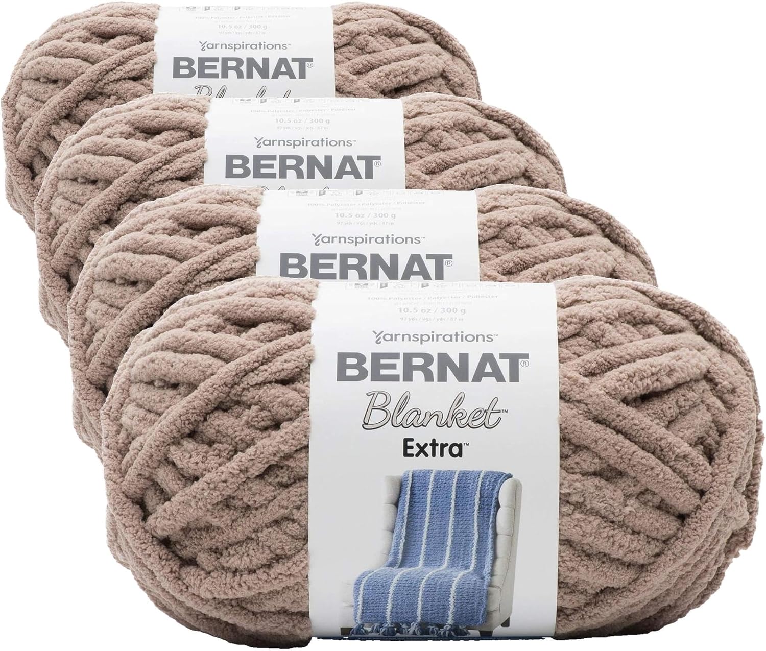 The chenille-style yarn you love is now thicker and quicker! Create blankets, baskets, pillows and more with the fast-stitching Bernat Blanket Extra! Weight Category: 7. Content: 100% Polyester. Putup: 10.5oz/300g, 97yd,87m. Gauge: 5sx7r = 4in/10cm on size US17/12.75mm knitting needles. Suggested crochet hook size: Q/15mm. Dyelotted: we try but are not always able to match dyelots. Care: machine wash and dry, do not bleach. Comes in a variety of colors. Each sold separately. Imported.