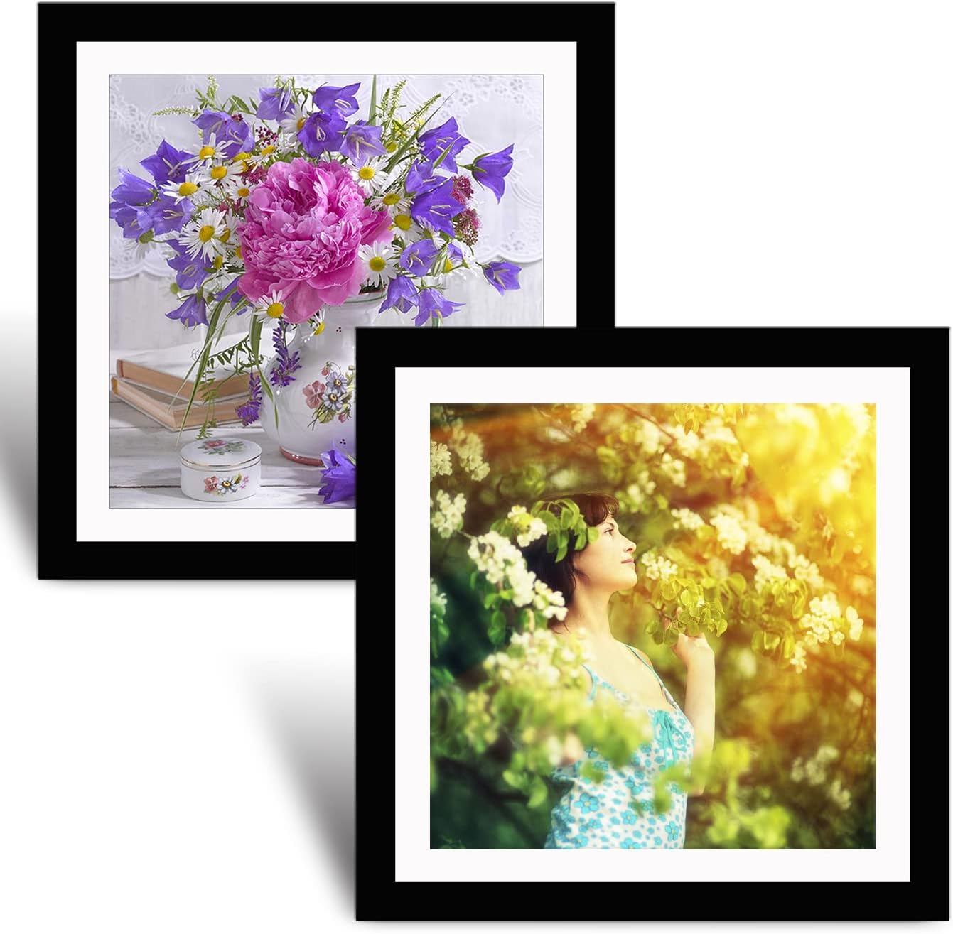 Specifications: Item Name: Betionol White Wood 12x12 inch Picture Frame. Frame Size: 13.1 X 13.1 inch. Opening Area: 12x12 inch. Compatible With: 12x12 inch pictures or photos (Without mat)/10x10 inch posters or photos (with mat). Material: Natural solid pine wood. Color: White. What's in the package: 2 x Pine Wood Frame, 2 x Organic Protection Glass, 2 x White Paper Mat, 2 x Back Mat, 2 x Bag of Hanging Kit.