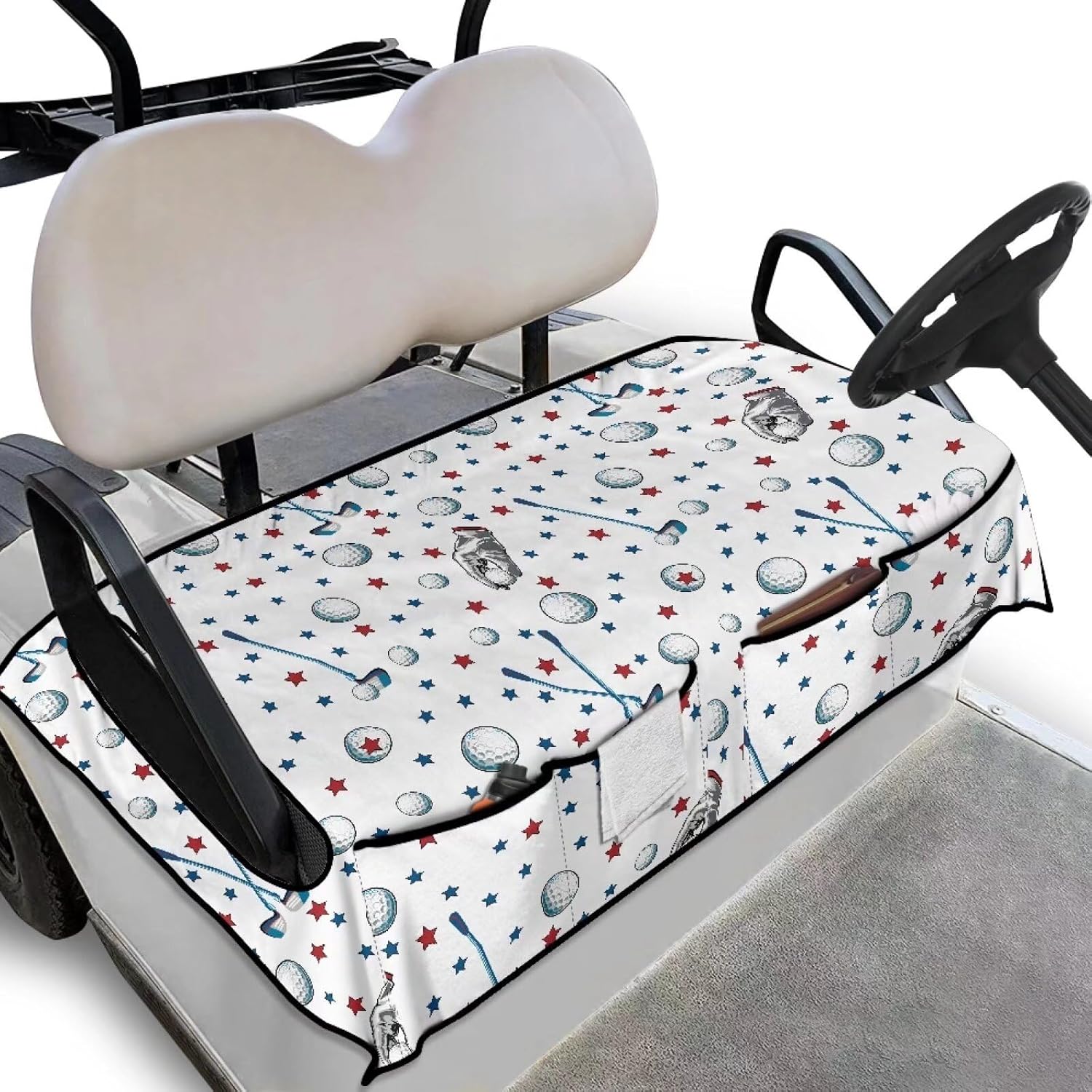 Biyejit Golf Cart Seat Covers, Universal Golf Cart Seat Towel Blanket with 4 Front Pockets & Nonskid Bottom Fits for Club Car and More 2 Person Seats Golf Carts Production Information Material: Thick Towel Pattern: Multicolor pattern printed About size: Golf Seat Covers: 52.36(L) x 32.28(H) inches; Two Holes: 14.96" x 2.5" Features: Non-Slip, Anti-hot, Easy Install, Machine Washable Multi-functional: Our golf cart seat blanket features 4 front pockets for you to store some accessories, such as sunglasses, towel, gloves, water bottle. This club cart seat covers is designed with holes on both sides to prevent the cushion cover from rolling around, making it easy to install and clean for a more comfortable seat. Notes Please allow little color difference due to different camera or light environment.