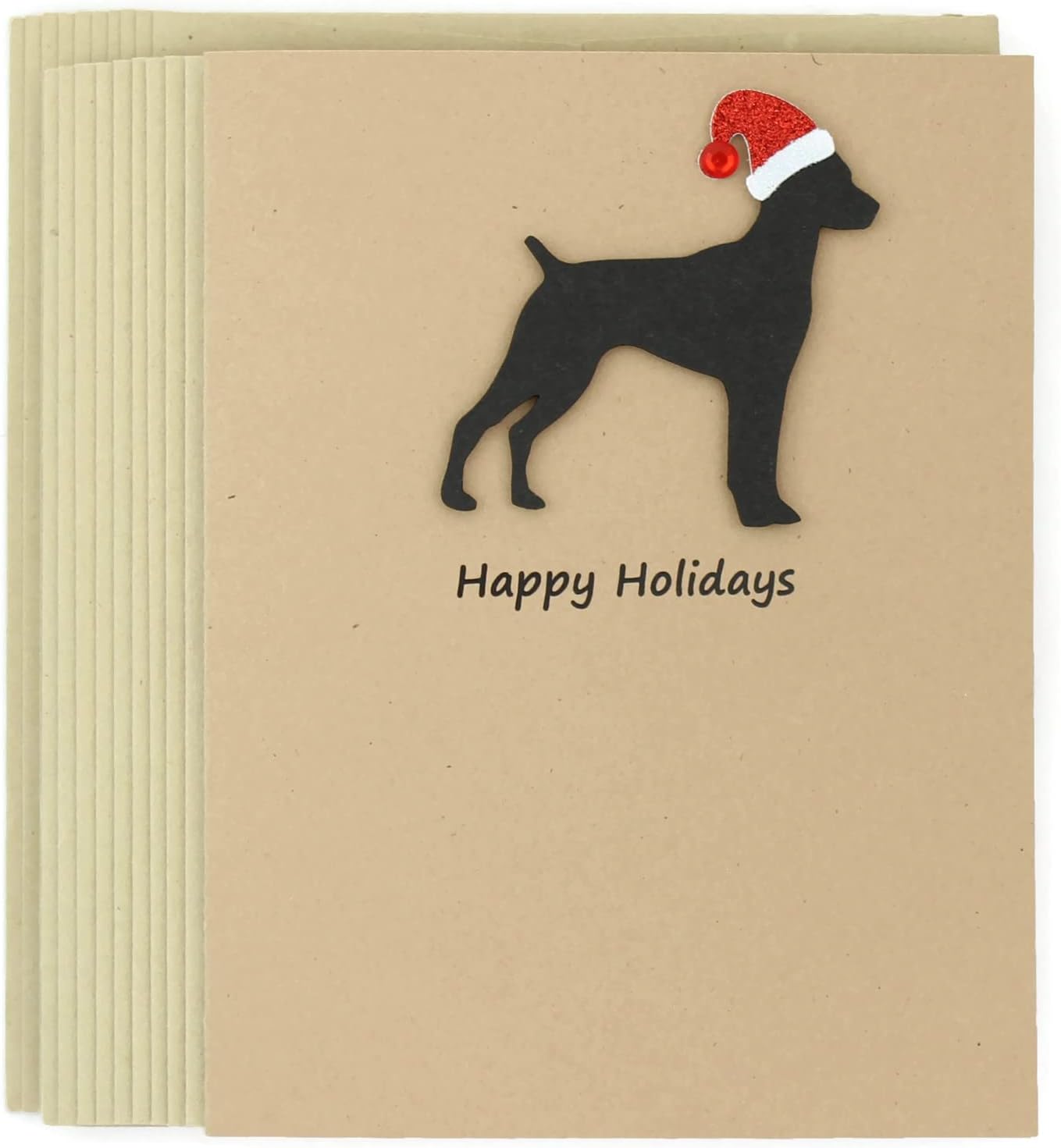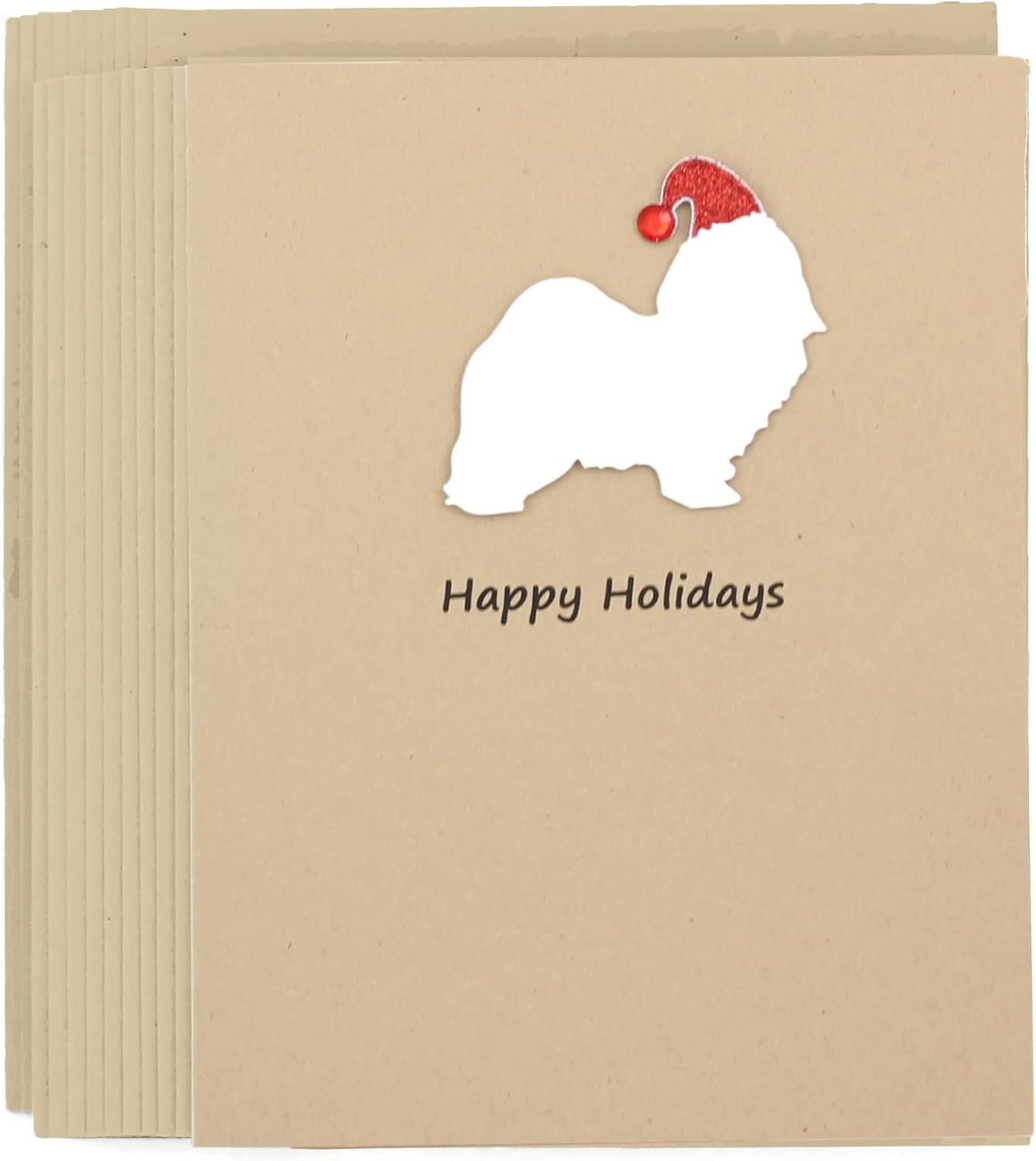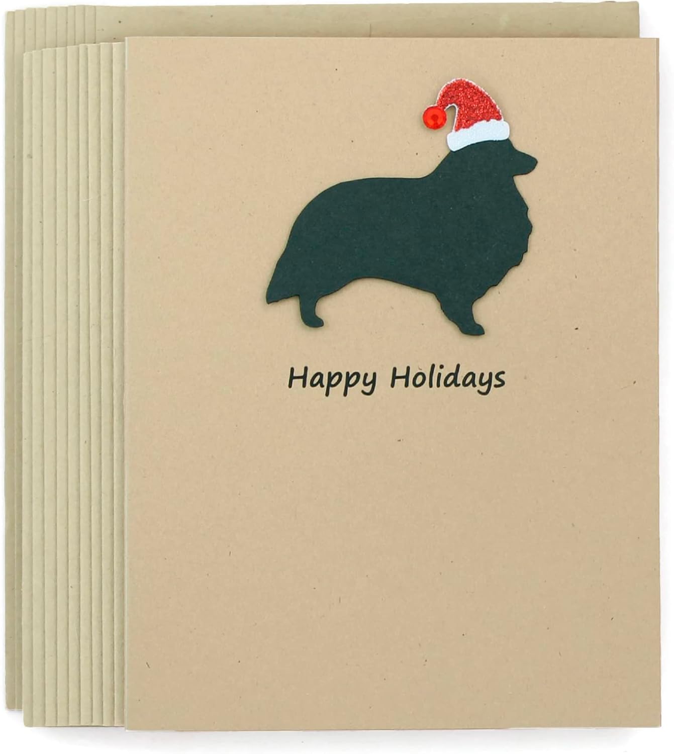 Black Doodle Christmas Greeting Cards - Pack of 10 FEATURES - Dog silhouette laser die-cut from cardstock and attached with foam adhesive to add dimension- Embellished with a sparkly Santa Hat- Card base made with Recycled 80 lb Kraft brown cardstock- Handmade in Minnesota, USA DETAILS - Front: Happy Holidays- Inside: Peace to all Critters Big and Small!- Colors: Kraft Brown card base/envelope- Size: 4.25 x 5.5 in (A2) - Quantity: 10 pack of cards and envelopes