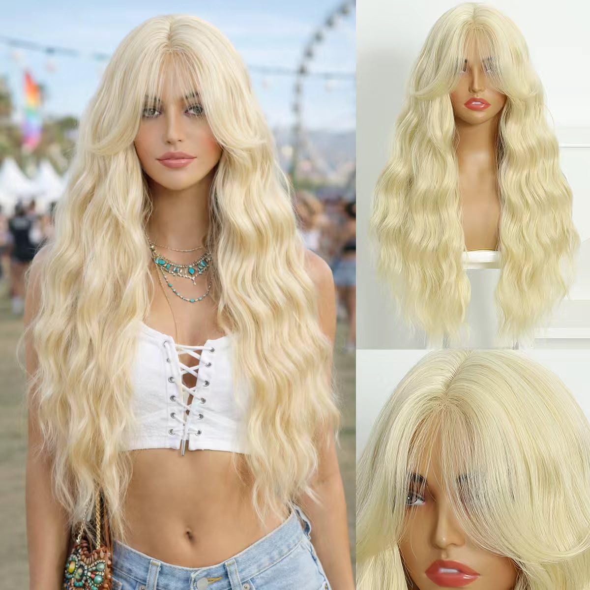 • Fashion Design:The wig has loose, beachy waves and French curtain bangs that give off an effortless, relaxed vibe. The easy-care style stays tangle-free all day.Designed to mimic the soft, kinky waves you get after taking out tight braids—effortlessly tousled, tangle-free, and lived-in from day one.