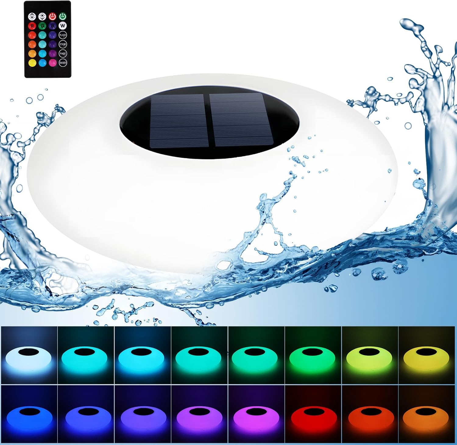 Do you have the trouble that the swimming pool is monotonous and lacks atmosphere at night?Choose solar swimming pool lights, no wiring required, automatic charging, waterproof and durable!đŚăIP67 waterproofăCan be completely immersed in water, suitable for various underwater environments such as swimming pools, fountains, fish ponds, etc.âď¸ăSolar chargingăBuilt-in high-efficiency solar panels, automatically absorb solar energy during the day, and intelligently light up at night, no batteries or sockets required, zero electricity bill burden, environmentally friendly and energy-saving.âđăRemote controlăEquipped with a remote control, you can easily control the lights without going into the water, switch, color switching, mode adjustment with one click.đă16 light colors, 4 light modesăWith 16 gorgeous colors to choose from, adapted to different scene requirements, it also supports 4 dynamic light modes of flashing, gradient, smooth, and strobe to create a unique light and shadow experience!đââăWidely usedăNot only suitable for outdoor environments such as swimming pools, fish ponds, fountains, gardens, etc., but also can be used for parties, weddings, terrace decorations, and even as camping lights.Product parametersLighting: 16 colors, 4 automatic color change modes, 8 levels of brightness adjustmentMaterial: PE+ABSSolar panel: Ď113mm, 5V, 1.1W, monocrystalline siliconBattery: 3.7V 2000mahPower: 2.5WCharging time: about 10 hours, can work continuously for 8-10 hoursSize: 25*6.7cmPacking list:Pool light*1Remote control*1Instruction manual*1