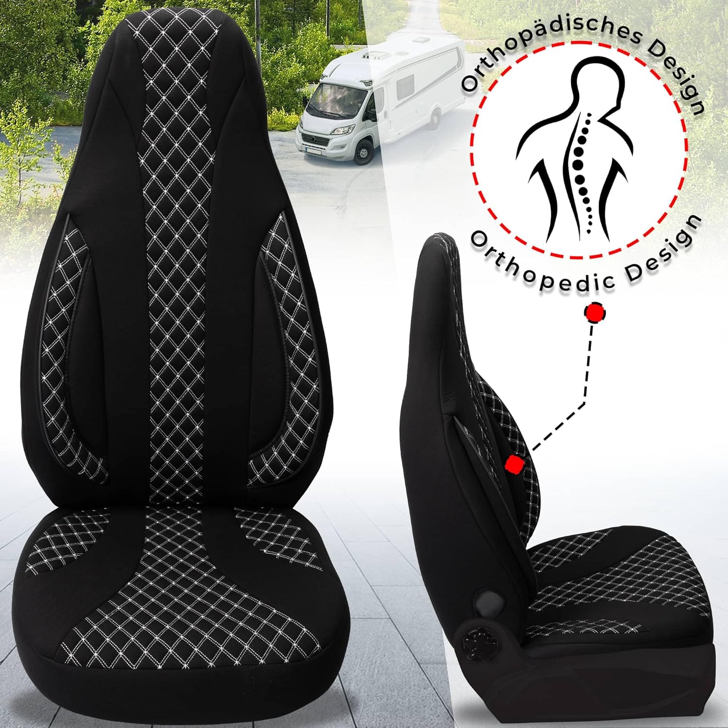 Suitable for Kabe Travel Master Classic type number(s): (740). Easy to install with Velcro system on the backrest. ✅ The protective covers are made of three layers of high-quality, durable and easy-care Lakoste fabric with foam lining, which is durable and easy to clean. They ensure maximum comfort and protection. The breathable material ensures a pleasant seating climate, especially on longer journeys. Box contents: 2 x seat covers, 2 x protective covers for the backrest, assembly instructions (English language not guaranteed). ✅ Suitable for heated seats and sewn with special airbag seam: enjoy comfort in any season with covers optimised for seat heating. High-quality protective covers for caravan seats from Bremer-Sitzbezüge GmbH - over 10 years of valuable experience in premium quality. Our seat covers are made in Germany and are made from 3 layers of high-quality material with foam lining to provide the best protection for your RV seats while ensuring style and comfort. The tailored covers are specially designed for the driver and passenger seat of your motorhome, providing not only optimal protection, but also a touch of luxury to your RV interior. The seats are fully covered. The headrests are completely covered with the cover. Product Features: Brand: Bremer seat covers. Trust in an established brand that has stood for outstanding quality for over a decade. HIGH QUALITY MATERIALS Our slipcovers are made of three layers of high quality, durable and easy care Lakoste fabric with foam lining, which is durable and easy to clean. They ensure maximum comfort and protection. The breathable material ensures a pleasant seating climate, especially on longer journeys. Perfect fit: Specially developed in a unique design to fit the seats of your motorhome, our car seat covers provide an elegant look. PROTECTION FROM WEAR - Prevent scuffs, stains and dirt on your RV seats and preserve their value. EASY INSTALLATION Thanks to the Velcro fasteners and fixing hooks, our slipcovers are easy to install and secure to attach. There are generous pockets on the back in which you can safely store your belongings. The cut-outs for the armrests are already integrated. NON SLIP - Covers stay securely in place even while driving on winding roads Suitable for seat heaters: enjoy comfort in any season with covers optimized for seat heating Why choose us? We pride ourselves on providing quality products that are both functional and stylish. Our goal is to make your motorhome holiday even more enjoyable by providing you with products of the highest quality. Package includes: 2 pairs of motorhome seat covers for driver and passenger seat. The covers are each inserted inside each other to keep the packaging small. Installation instructions (English Also available as assembly video on Youtube Availability: Our seat covers are available in various colours and designs. Please select the desired colour and number from the drop down menu above. Delivery information: We provide fast shipping and secure packaging to ensure your order arrives safely and in time. Customer Service: We attach great importance to the satisfaction of our customers. If you have any questions or problems, please contact us. Please feel free to contact us. Invest in the protection of your RV seats and order our high quality protective covers today! Make your next road trip a comfortable and stylish experience! If you need protective covers in the same design for your rear benches, please feel free to contact us. Here too, we offer you first-class service. Logo (chrome style or Bremer seat covers) & colours may vary slightly. This is an accessory item and not a product of the original vehicle manufacturer or a separately authorised by him.