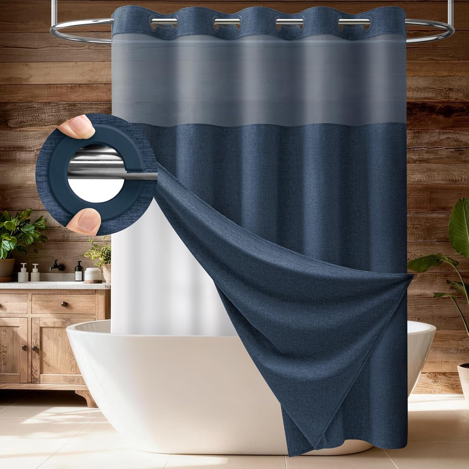 This ringless shower curtain is made from a durable polyster blend fabric that stays bright and resists fading. The simple two layer design brings a clean, modern look to any bathroom. Built with integrated hooks, easy and fast installation—no any hooks needed. The water-repellent liner helps water roll off quickly, keeping your bathroom dry while allowing soft natural light to filter through, and is machine washable, making it easy to keep fresh and clean. Available in multiple sizes such as 36x75, 54x81, 60x75, 72x75, 72x78, 72x81, 72x87, 72x99 and more, it fits a wide range of shower spaces in homes, hotels, apartments, and RVs.