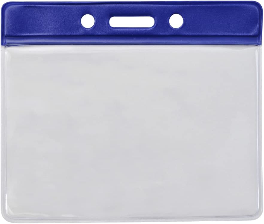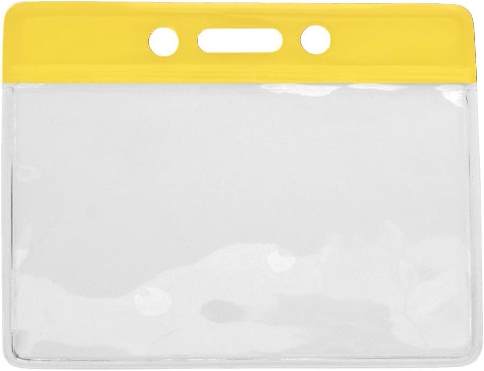 Horizontal Vinyl Color-Bar Badge Holder. Designed to hold one standard credit card sized ID badge up to 3 1/2 x 2 1/4 inches. Durable and tear resistant plastic sleeve has a color bar top with a transparent bottom to show nametags, scannable barcodes or other important credentials. Perfect for travel, business, school, hospital, hospitality, volunteers, visitors and more. Lightweight, thin, flat, flexibly vinyl sleeves that fit well in luggage, travel bags or purse. These make a great economical choice for the team, staff, group. company, volunteers or students for field trips, outdoor retreats and theme park adventures. Easy to slide in your printable inserts, name tag, laminated cards or I'd badge from the top opening vinyl sleeve for visibility on one side. Practical for DIY nametags or ID badges for classroom activities, family or school reunions, poll officers during elections, work contests, fundraiser, social event, festivals, PTA, student orientation, art exhibition and more