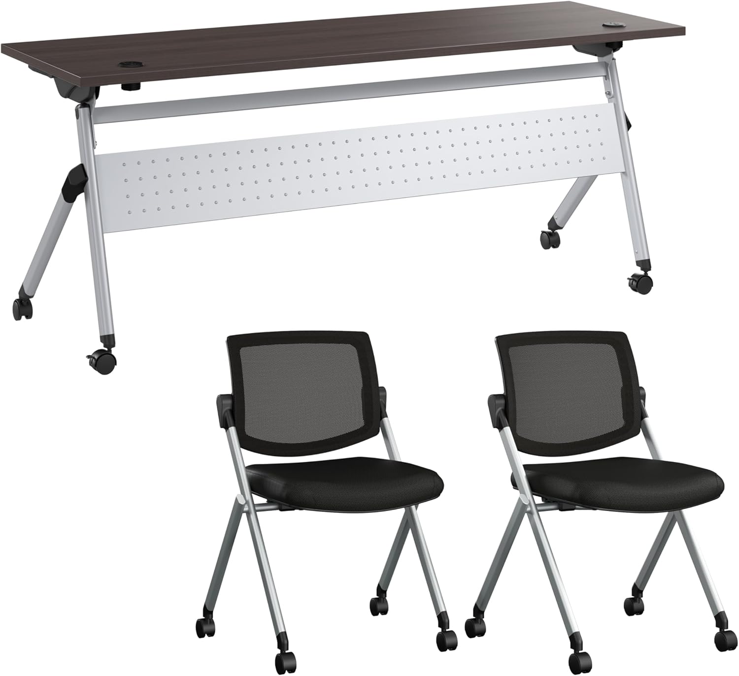 Transform your classroom or training facility with the Bush Business Furniture Envision 72 inch Folding Training Table with Powered Grommets and 2 Chairs, designed to provide ample workspace that folds and stores easily, making room for dynamic learning experiences. Durable 1-inch thick thermally fused laminate surface protects against scratches, stains, and other cosmetic damage and offers 2 wire management grommets on surface. Desktop includes 2 powered grommets to keep devices charged with a standard outlet as well as USB-A and USB-C ports. Table's sturdy metal base gives the work surface a weight capacity of 75 pounds to support a laptop and more. Dual-wheeled casters roll on carpeted or hard surfaces, allowing the table to lock in place for secure positioning and the chairs to be set up and rearranged at a moment's notice. Chairs' steel frame provides structural strength with a weight capacity of 275 pounds, while the cushioned seat measures 18W x 18D. Breathable nylon mesh backrest is great for staying cool in warmer environments. Easy-to-use lever flips the top vertically, allowing multiple folding tables to nest together, while the folding chairs are designed to be stacked in rows for convenient storage. Bush Business Furniture's commitment to safety includes rigorous testing that meets or exceeds ANSI/BIFMA x5.5 commercial test standards. Backed by the Bush Business Furniture 3 Year Manufacturer's Warranty.