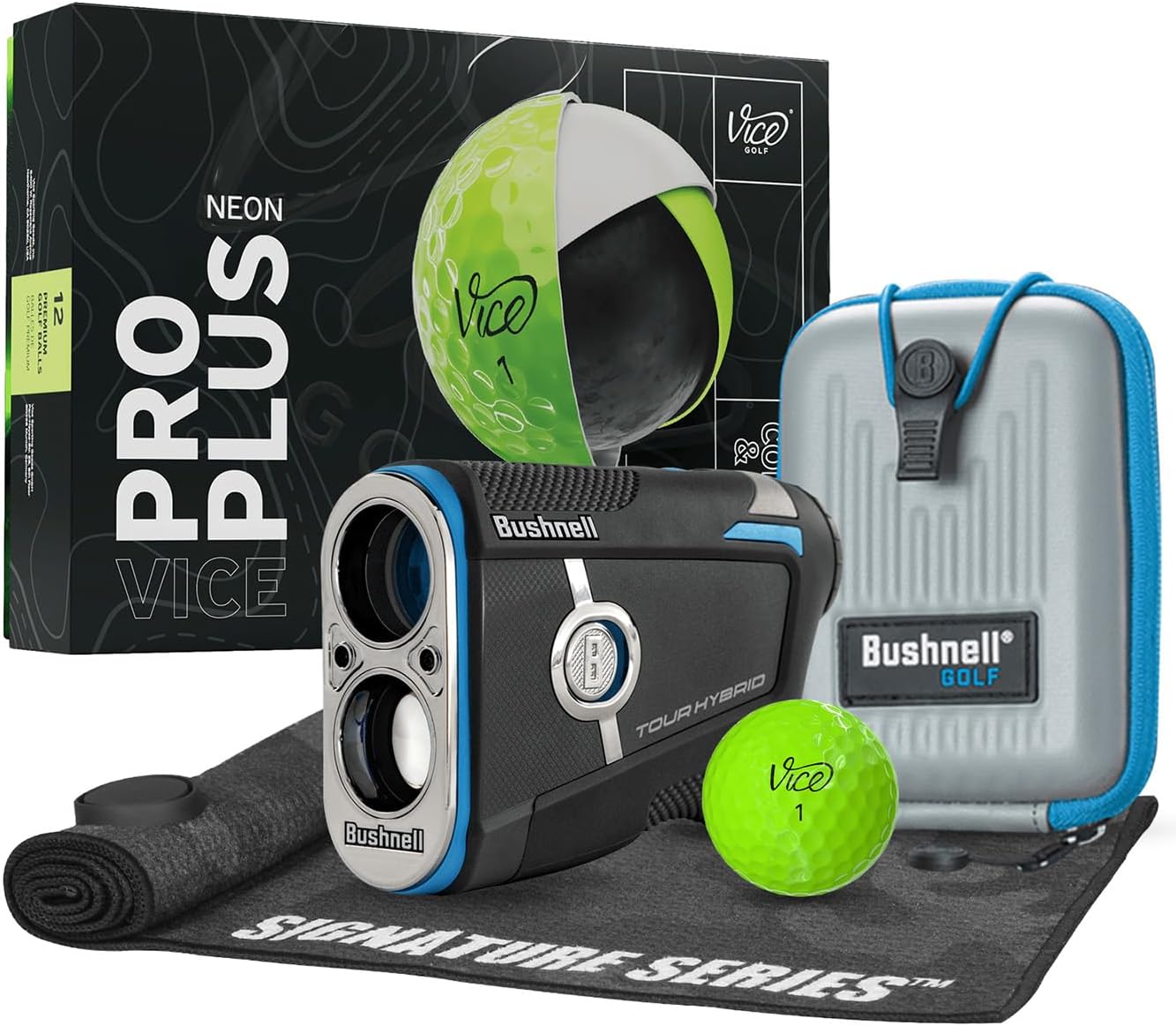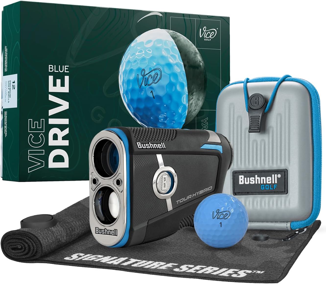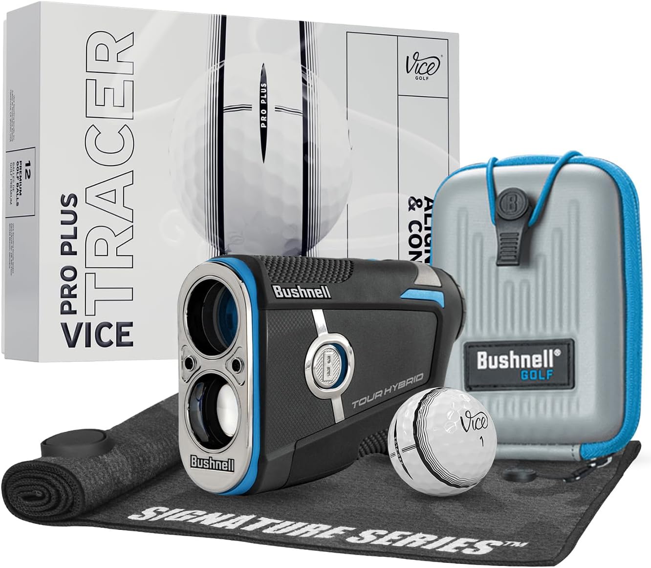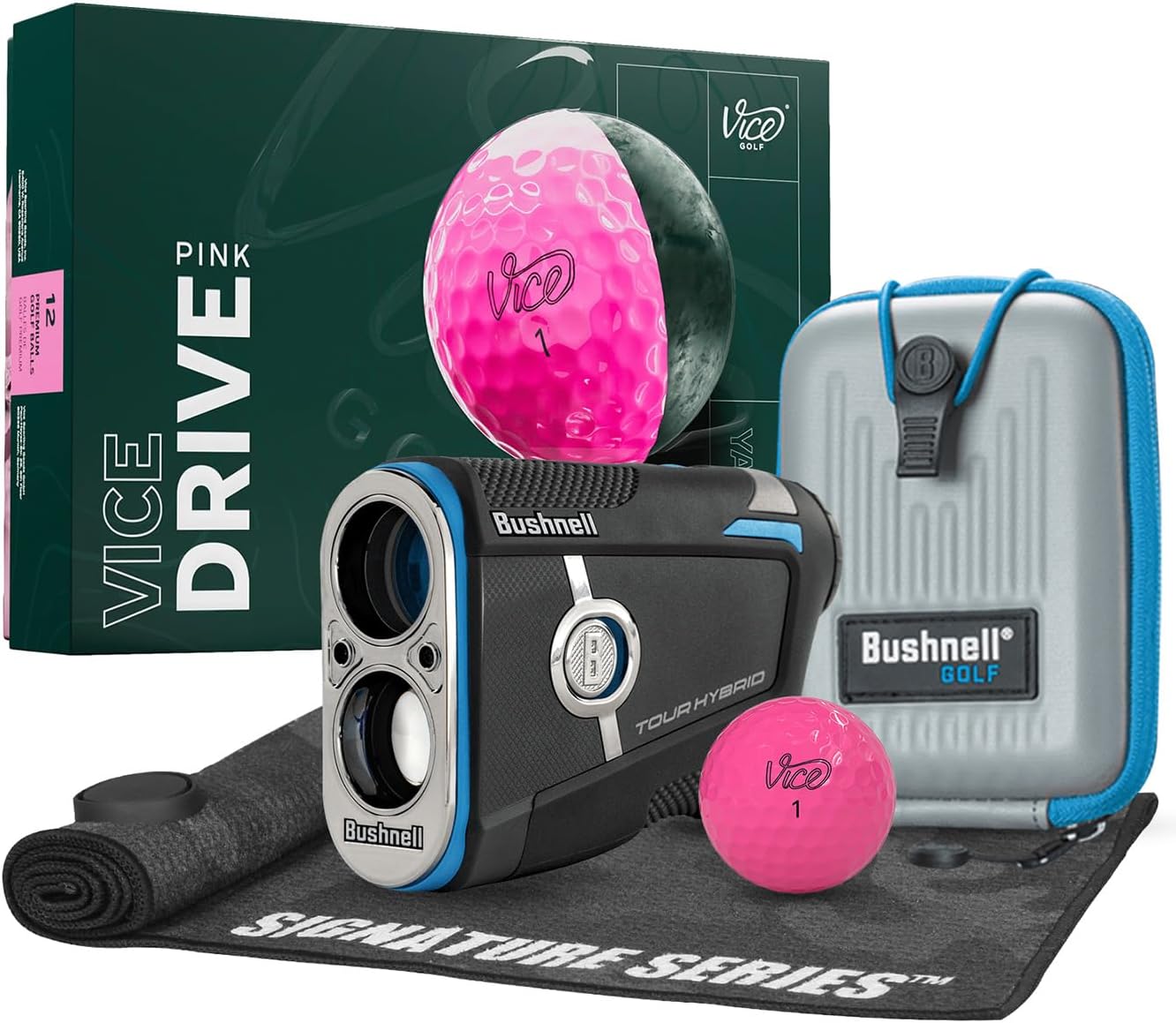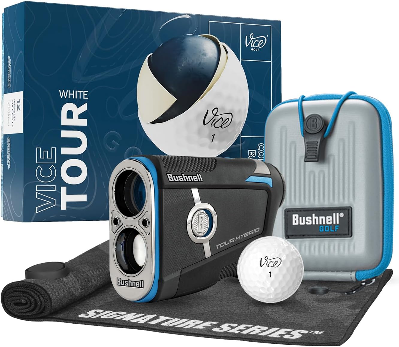 Experience Slope distances like never before with the Tour Hybrid. Our first device to feature Slope compensated laser distances AND Slope compensated GPS distances. Confidently make club selections with both lasered distances to the pin as well as GPS-powered front/center/back yardages right in the display. Our first device to feature Slope compensated laser distances AND Slope compensated GPS distances. Confidently make club selections with both lasered distances to the pin as well as GPS-powered front/center/back yardages right in the display. Built-in GPS and Slope-adjusted front/center/back distances are right in the viewfinder. No phone, no signal needed. Just consistent, precise GPS and laser readings in one. Play your best game with a ball that fits you. This bundle includes a dozen Vice golf balls. Take strokes off your game with the alignment aid, use it to visualize your aim on the tee or lining up a putt.