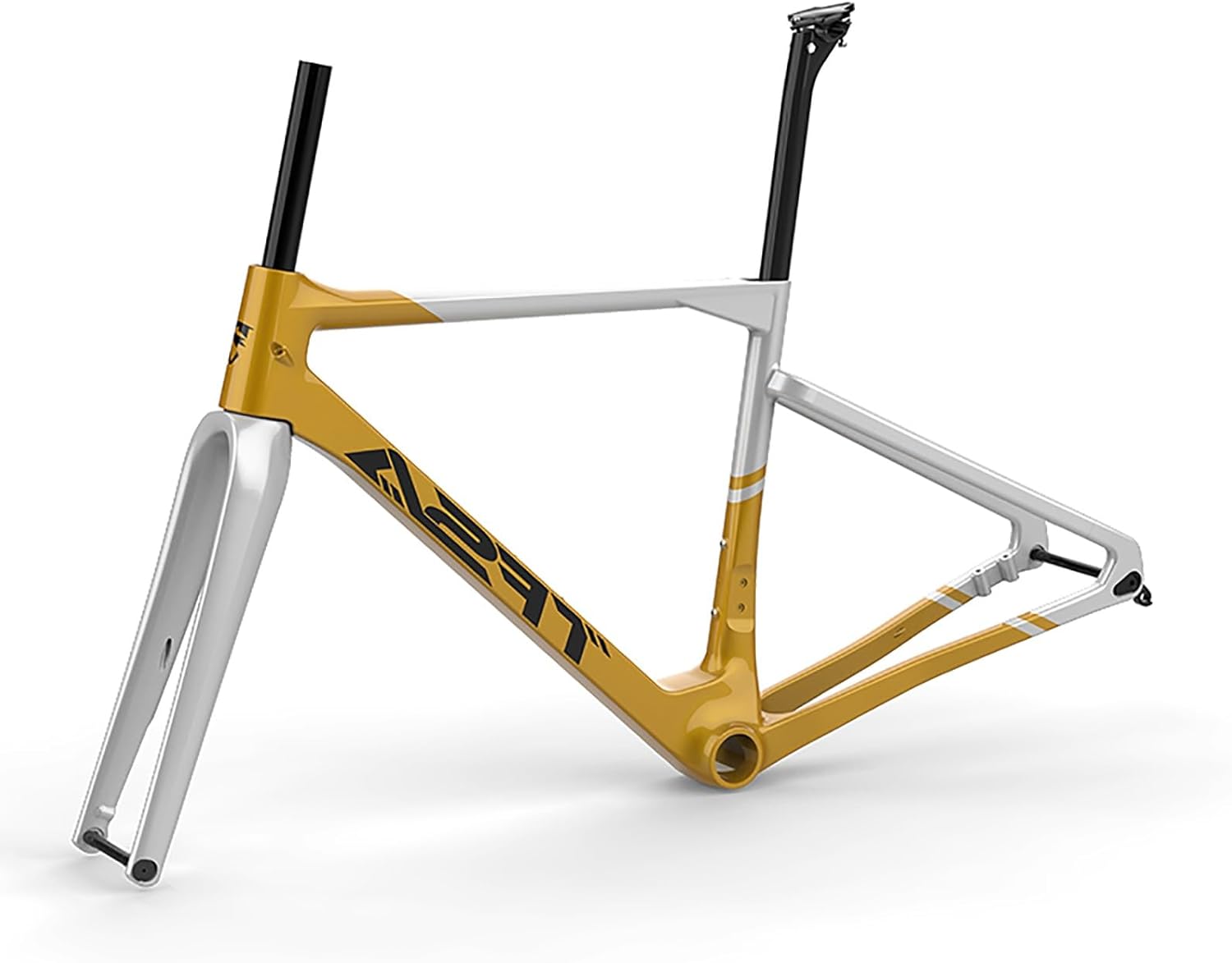 Carbon Road Bike Framest – Lightweight, Stiff & High-PerformanceAerodynamic Design – Optimized tube shapes cut through wind for maximum efficiencyHidden internal routing: The frame with internal routing is simple and beautiful, with low wind resistance, and will not be affected by external forces on shifting and braking. The shifting cable is not easy to age.Frame name: Carbon fiber disc brake road frameThe product includes: frame + front fork + seat tube + headset + thru-axle rodMaterial: Carbon fiber T800Size: 47/50/53/56 CMBottom bracket: BB386Headset: 1-1/8" to 1-1/2Opening: 142x12 rear 100x12 frontWeight: frame 1016g, front fork 348g, seat tube 348g (53CM) maximum difference 40gDisc size: 140/160mmMaximum tire: 700Cx42C/MTB: 650B (27.5er)x2.1"Notice:1. Please allow slight dimensional tolerances due to manual measurements, lighting in photography may cause color differences from real life.2. Please double check the size details in our list according to your actual situation to make sure you buy the right Bikes frame.