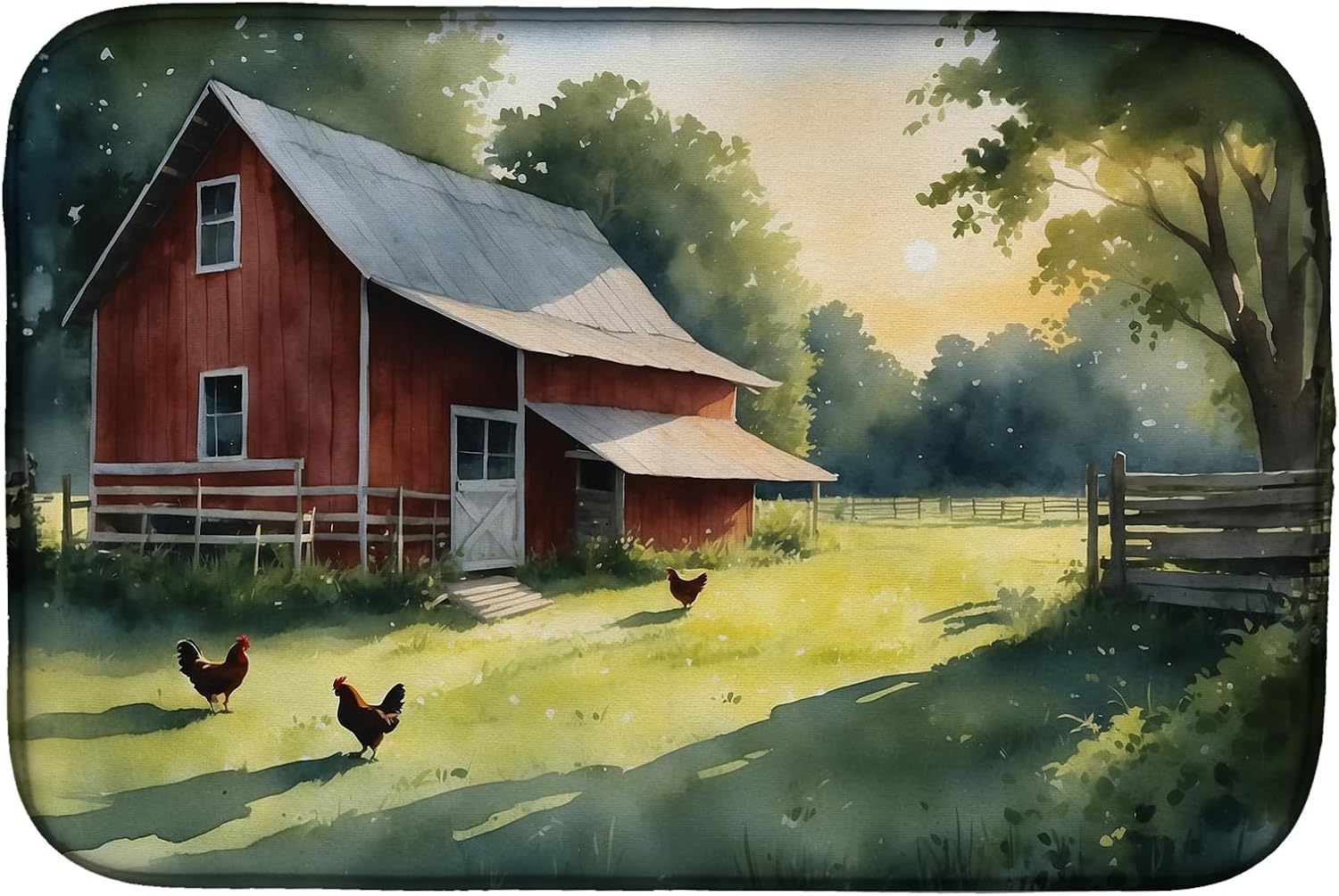 Dish Drying Mat featuring breed specific Chicken artwork. Say goodbye to messy countertops and soggy dish towels with our innovative dish drying mat. Our high-quality dish drying pad is designed to keep your countertops dry while offering a stylish and efficient solution. Whether you're air drying dishes, glasses, stemware, silverware, pots, pans, bottles, or even fruits and vegetables, our dish mat is the perfect choice. The 14 inches x 22 inches size fits most counters and dish drying racks, and the non-slip design ensures stability. Made with water-absorbent polyester and a polyurethane foam insert, our dish drying mat is not only functional but also durable. It's machine washable and printed in the USA for long-lasting use. The beautiful artwork adds flair to your kitchen decor, making it a perfect housewarming gift or present for any occasion. Upgrade your kitchen experience with our absorbent and versatile dish drying mat.