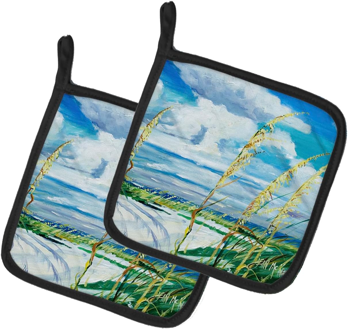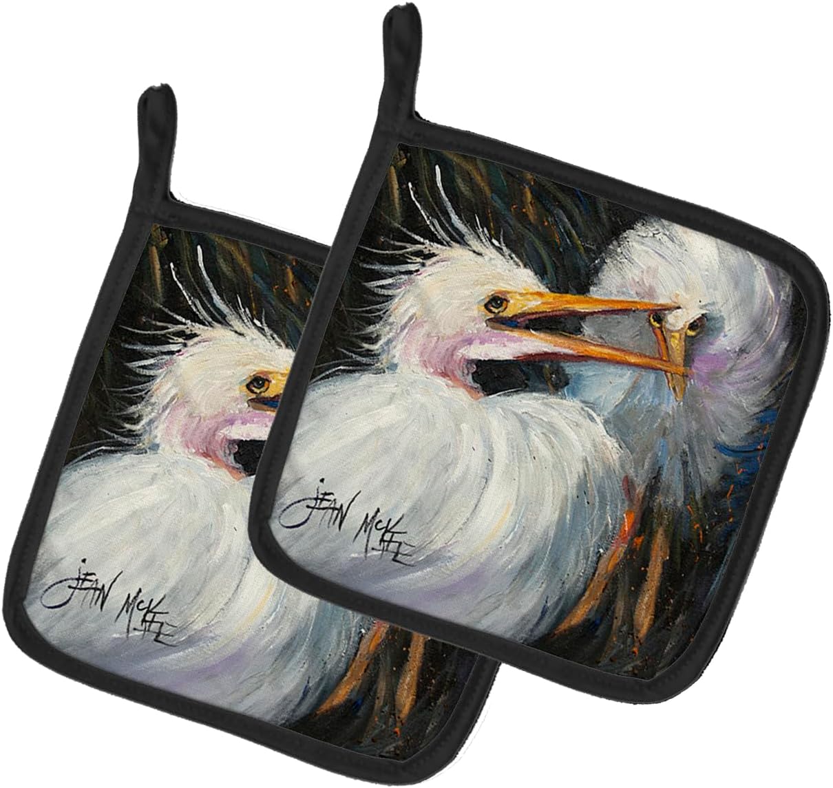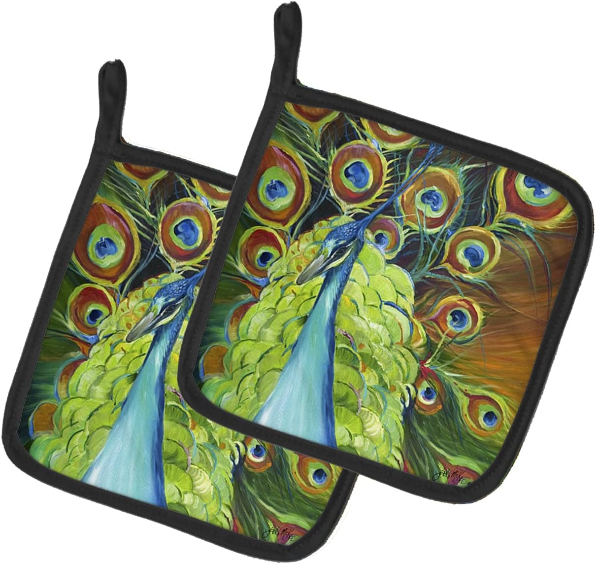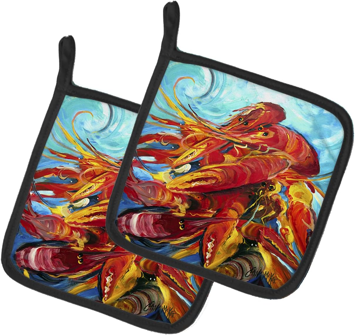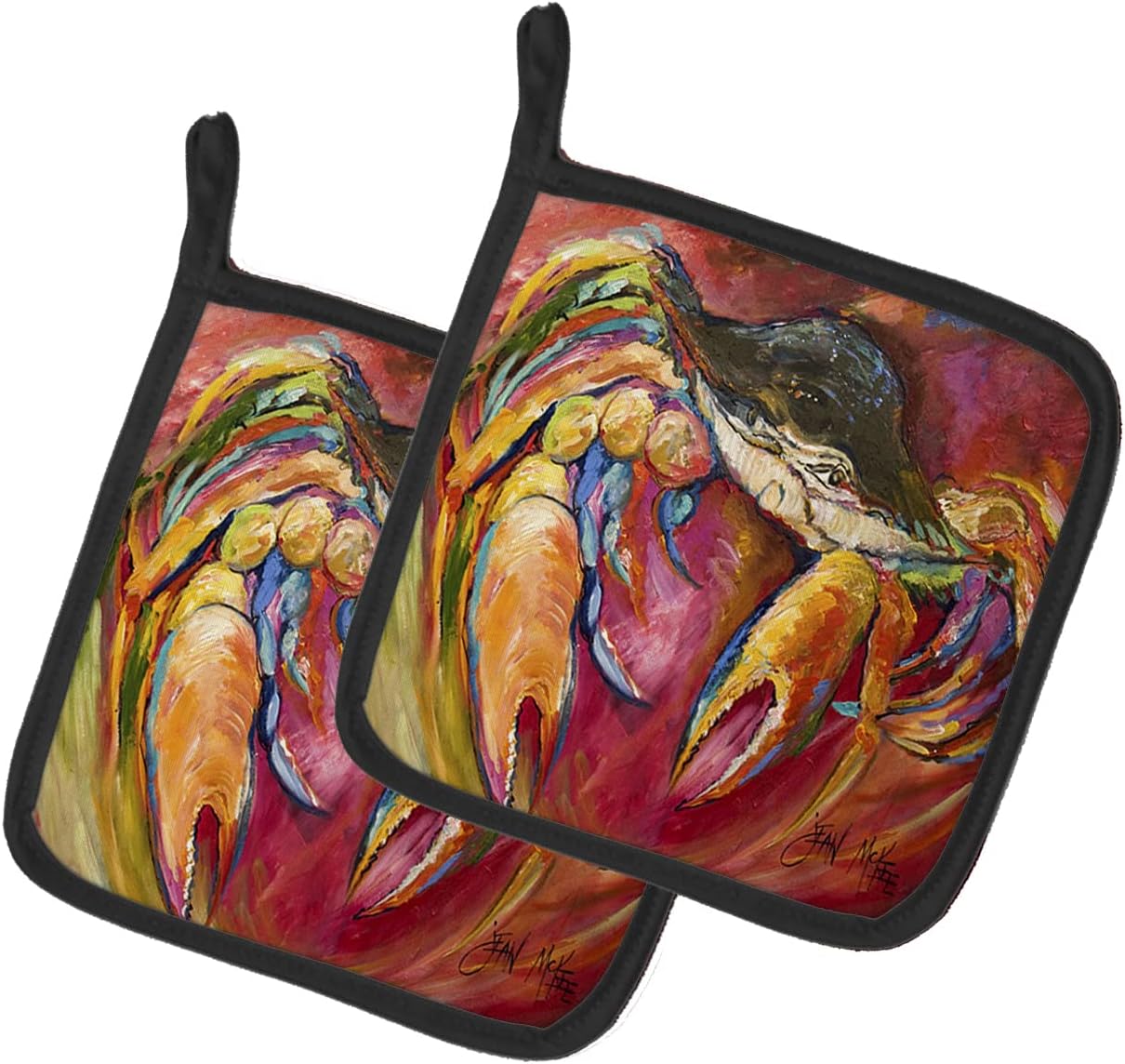 A pair of pot holders to match your kitchen decor. Made in the USA these are thick and functional. Full Color artwork decorates the front polyester fabric of the hot pad and accented by a black trim. Use these at as a trivet for your Thanksgiving or Christmas tablescape. Filled with insulated fabric and quilted for durability. These colorful pot holders will make a great gift for your favorite home cook or executive chef. Each pot holder measures approximately 7 1/2 inches by 7 1/2 inches. A hanging tab is inlcuded.