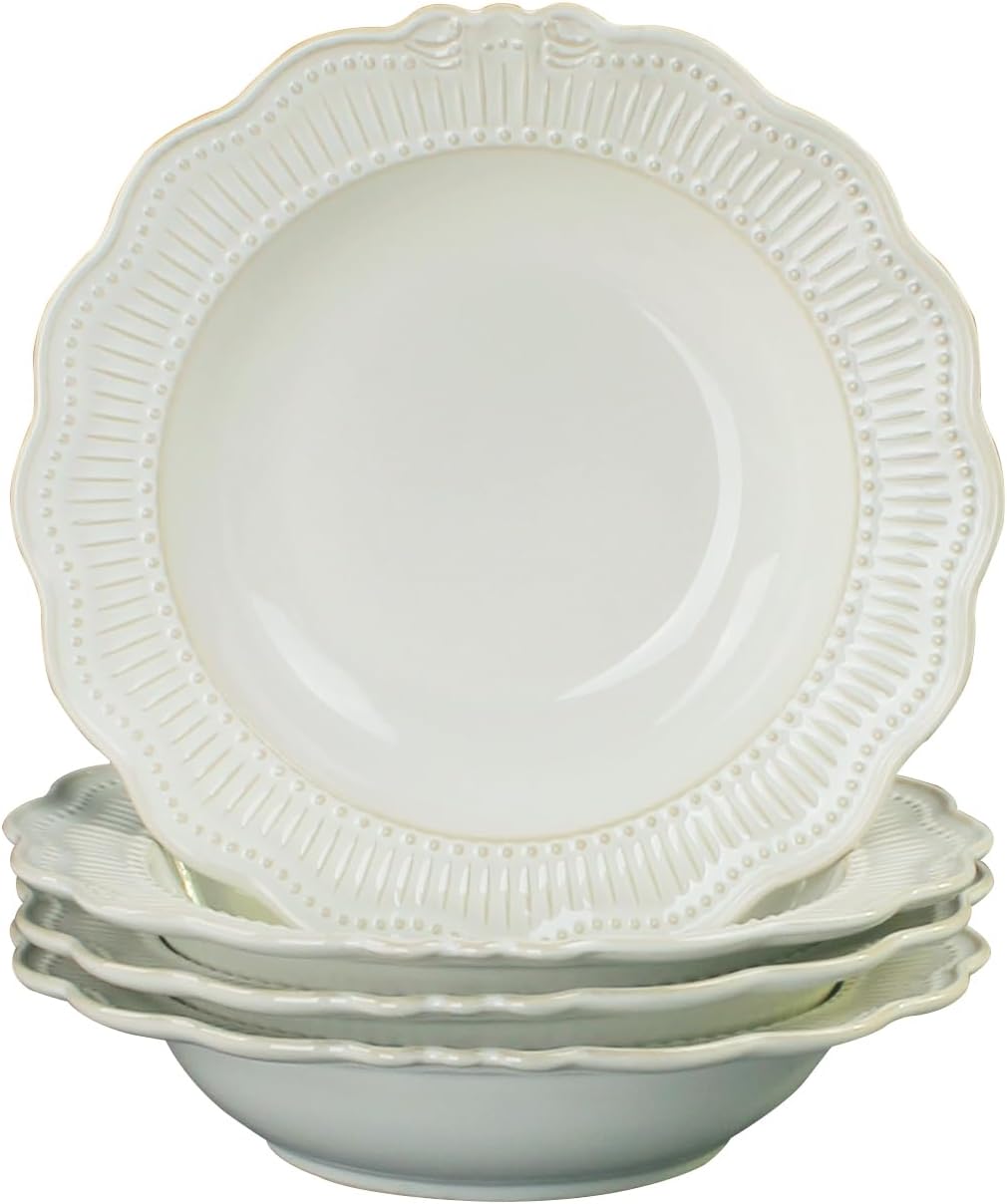 Pheiaez Ceramic soup bowl and pasta plate set (4 pieces) 10.1 oz. Embossed soup bowl, porcelain wide-rimmed pasta plate, vintage cream-style plate, microwave and dishwasher safe, scratch-resistant. Ideal Size and Capacity: With a total diameter of 9.6 inches and an inner diameter of 6.6 inches, this 10.1-ounce container is a perfect size and depth, easily holding soups, pasta, salads, cereals, and noodles to meet diverse dining needs. Elegant Vintage Design: The delicate embossed pattern and unique scalloped edge add a touch of classic and romantic European style to your table, enhancing the dining experience. Premium Ceramic Material: Crafted from high-quality ceramic, this durable, scratch- and shatter-resistant container ensures long-term use, making it ideal for everyday and special occasions. Easy to Clean: Microwave and dishwasher safe, it makes heating food and daily cleaning easy and convenient, saving you time and effort for a worry-free lifestyle. Ideal Home Decor and Gift: The creamy white color complements various home décor styles, making it a thoughtful gift for housewarmings, weddings, or holidays, showcasing taste and style.