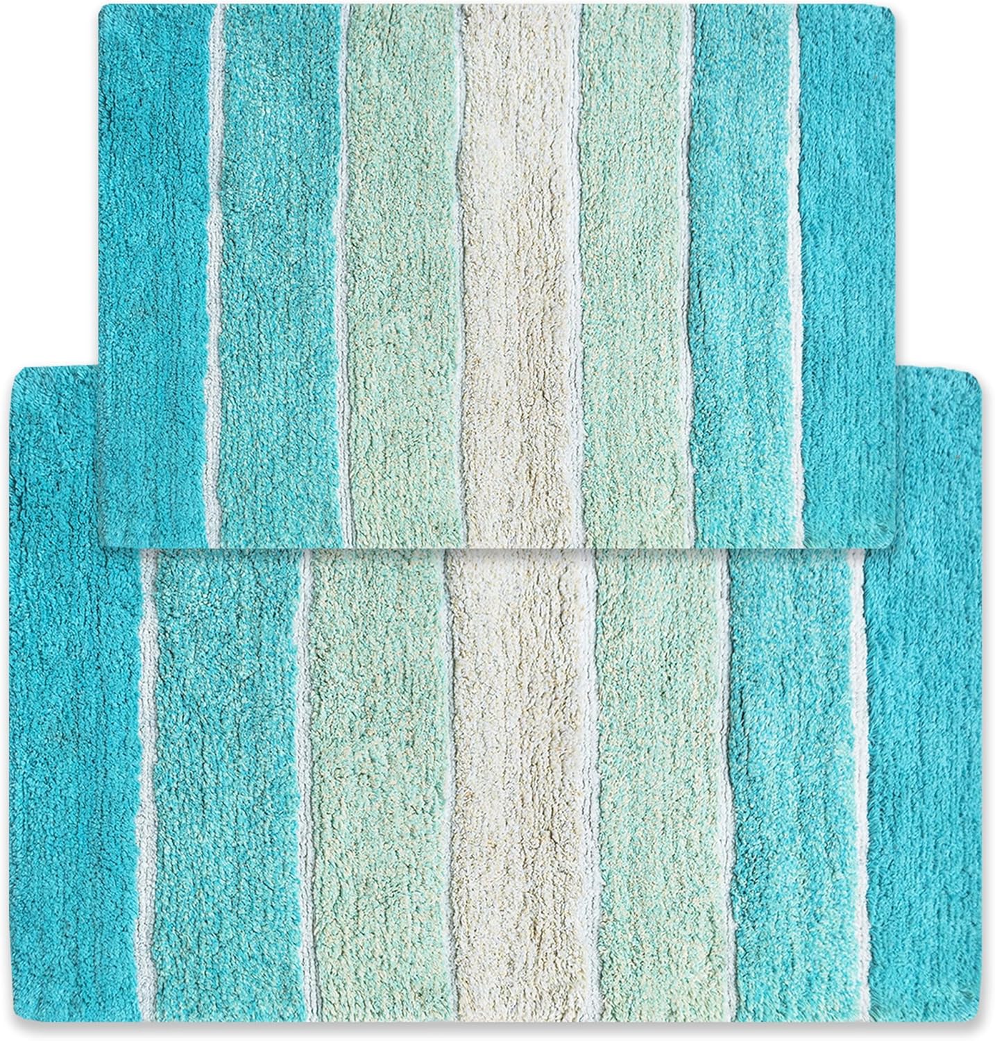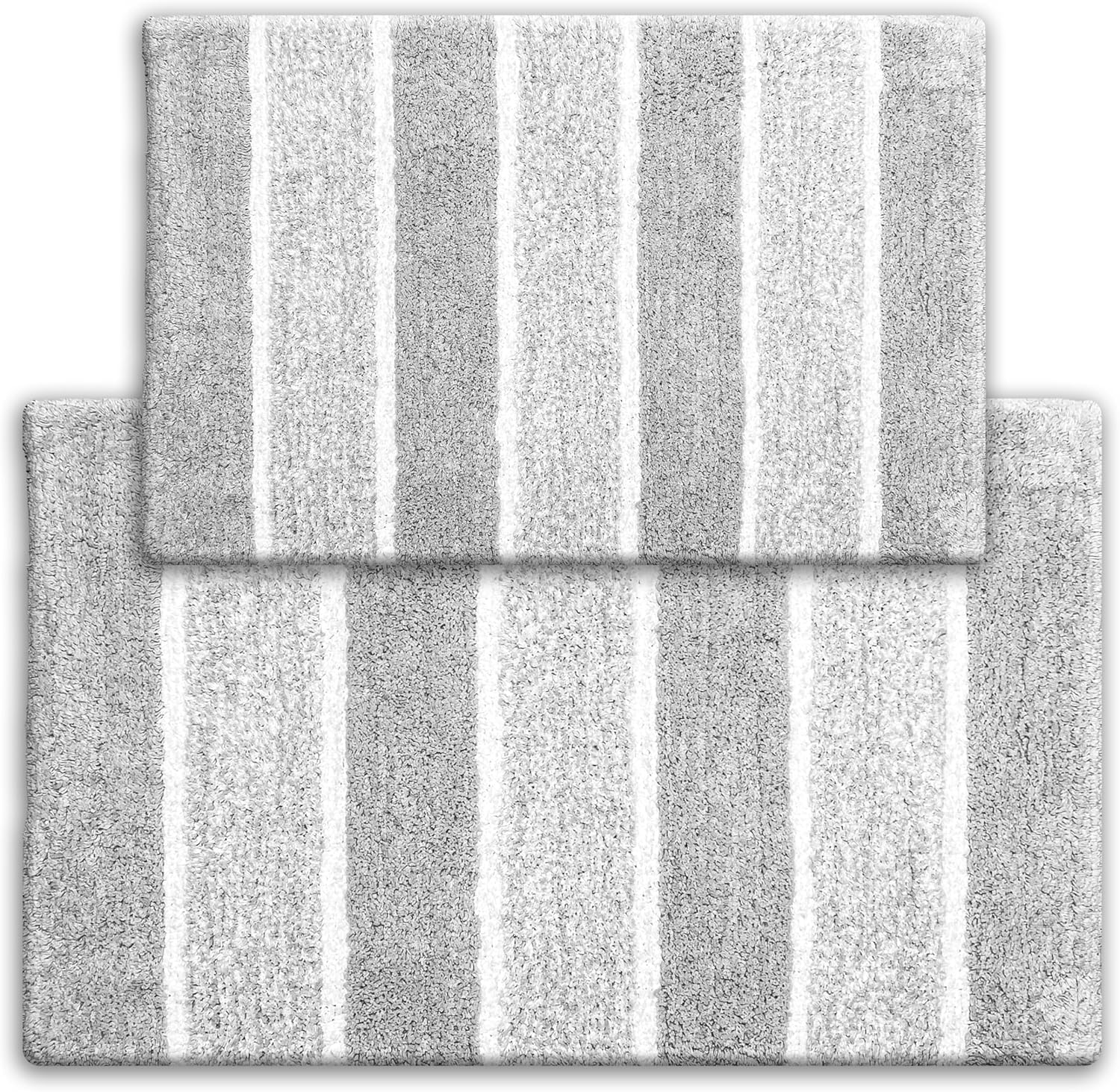 At Chardin Home, we believe that functionality and style go hand-in-hand. Our designers and artisans work together tirelessly to bring you a practical yet beautiful bathroom mat that will transform your bathroom into the perfectly cozy, sophisticated and fashionable oasis that you desire. We take pride in using superior quality, pure cotton yarns to create a design in colors that works well with all your bathroom accessories including but not limited to shower curtains, soap dispensers etc. This contemporary bath rug set (2-piece set) is made with precision and its distinctive tufting provides for elevated patterns which are very soft to touch. These comfortable rugs are foldable, making them easy to store in compact spaces. Each set contains two rugs of different sizes. Both the rugs are rectangular in shape and can help accentuate the look of your bathroom, without compromising utility. Each stripe is made using either threads of one color or two colors mixed together to give it the look of an Ombre Bath Mat. So Elevate your home dècor with these essential and elegant rugs that work with any aesthetic, multiple sizes available to fit multiple spaces in your home.