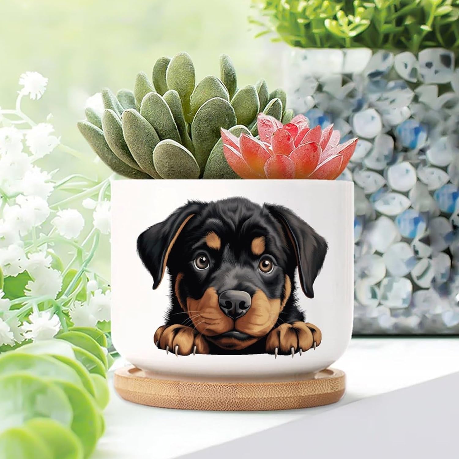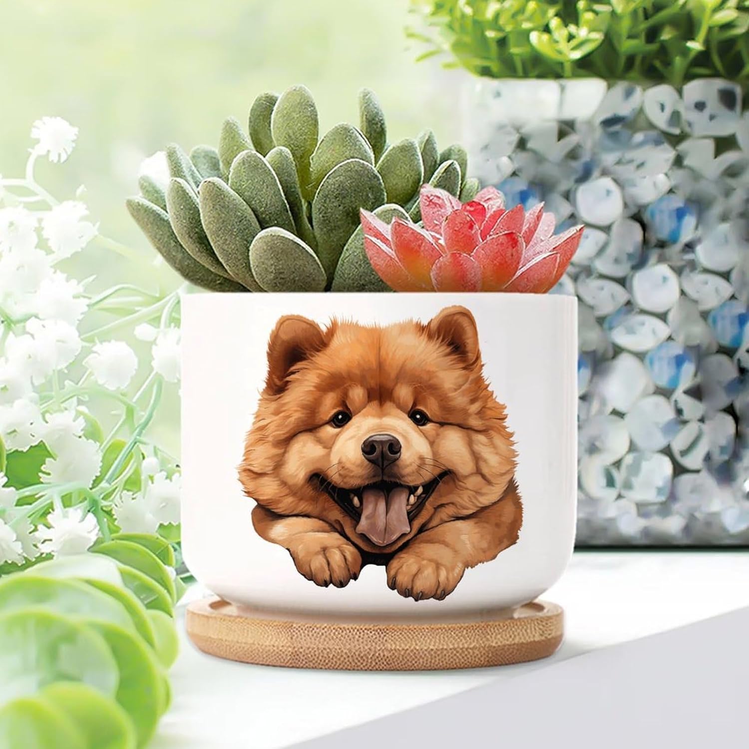 Size: 6cm×5.5cm (2.4×2.2inch) Material: Ceramic flower pots. Double Sided Printed. Product Contains: Ceramic planter + bamboo trays Suitable: Succulents, cactus, cacti, other small flowers and green plants. Best Mother's Day Gift for mom. Perfect gift for women. Suitable for both indoor and outdoor use.