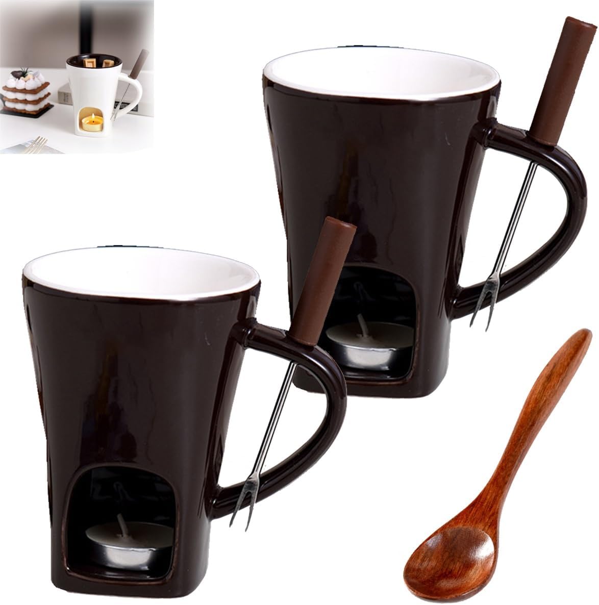 Chocolate Fondue Mug, Fondue Cups with Forks, Chocolate Melting Mug, Taza Para Derretir Chocolate, Ceramic Personal Chocolate Melting Cup for Cheese, Tealight Candle Mini Simmer MugNote: Not included tea light▲SpecificationsName: Chocolate Fondue MugMaterial: Ceramic Size: 10*12*13cm/ 3.93*4.72*5.11inCapacity: 200ML▲Package Include:1/2/3 set * Fondue Cups with Forks (Not included tea light)1 pc * Wooden coffee spoonService Description:If you encounter any questions during the use of this product after purchasing, please feel free to contact us, and we will give you a satisfactory response within 24 hours