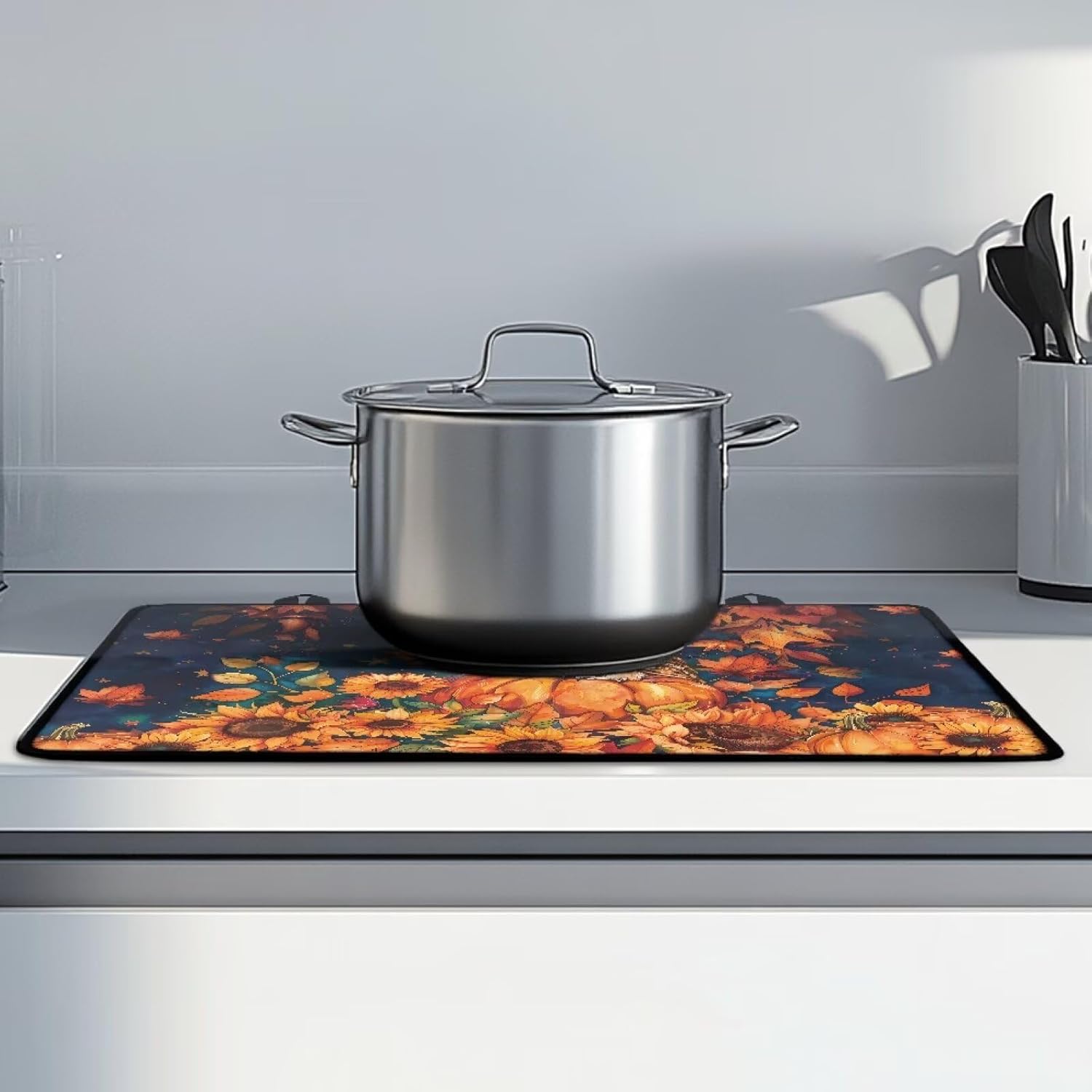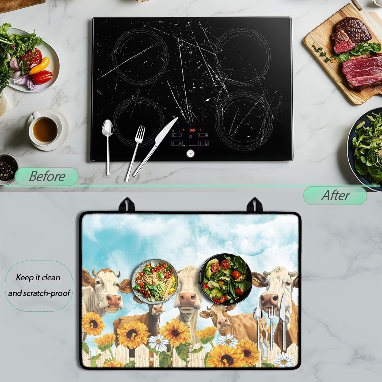 Basic Information Fabric: polyester rubber Size: 20.96x29.18 in/53.23x74.11cm Package Details: you will receive a glass cooktop protector Functional Features: Soft and thick, skin-friendly, comfortable and elastic, prevent burns or scratches on your kitchen tabletop, the back side is made of rough materia, non-slip, anti-oil stains, wear-resistant, good adsorption, it can be better fixed on the table without shifting The electric hob insulating mat covers food stains and grease stains from daily life, stops the grey layer and prevents scratches when the induction hob is not in use Hand washable or machine washable, it will remain as good as new for many washes, comes with a hanging rope to hang on the kitchen wall to prevent grease or stains Universal for most sizes of electric cookers, ovens, washing machines, can be used as a chopping mat in the kitchen, is a good helper for housewives, stylish personalised pattern, high temperature resistance, not easy to fade, is the perfect decoration for daily or special festivals