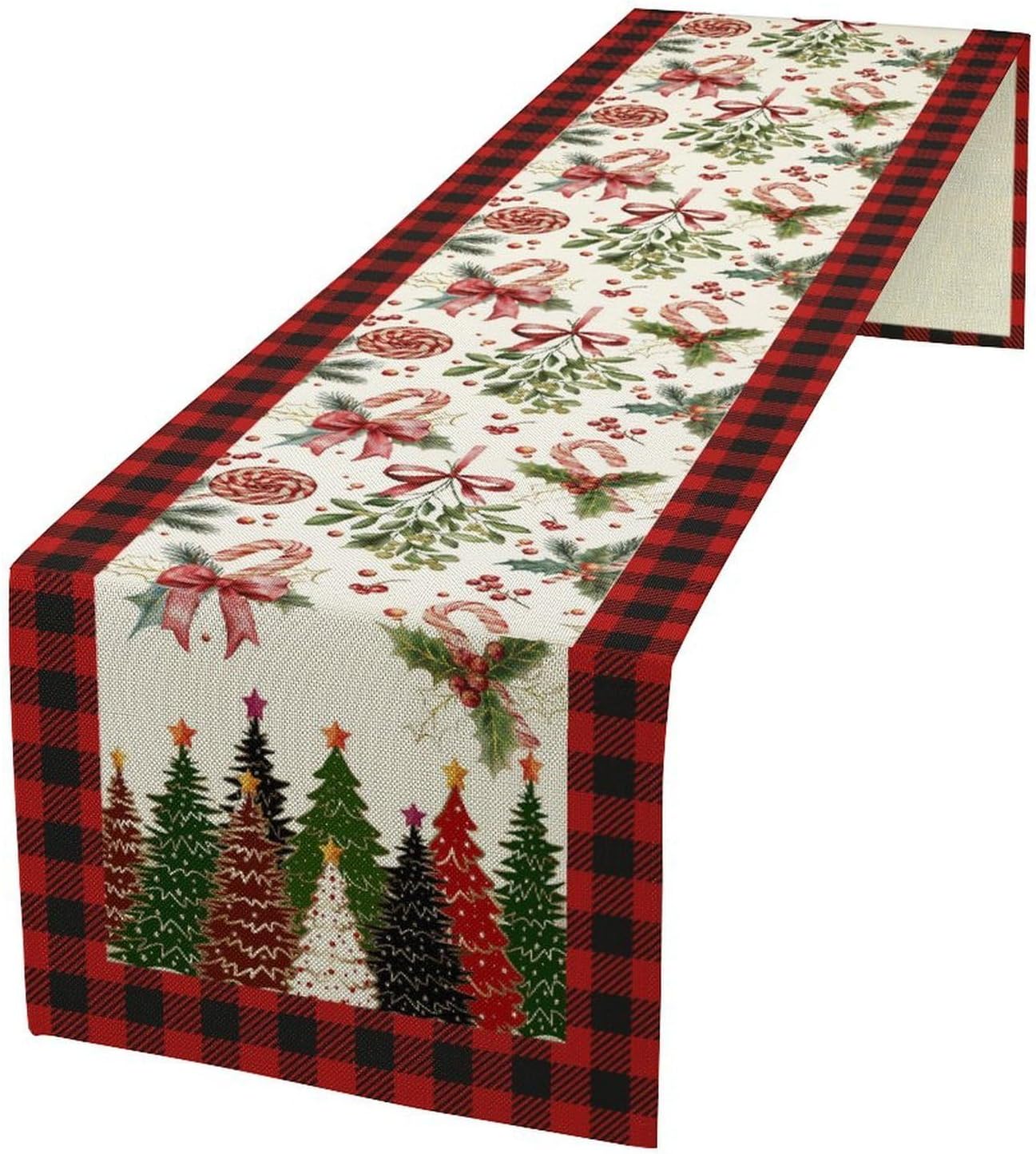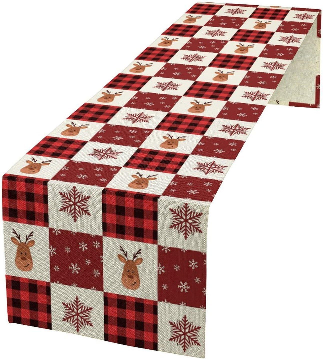 Christmas Deer Pine Tree Table Runner Red White Buffalo Plaid Seasonal Winter Party for Dresser Coffee Table Mantel Dining Indoor Outdoor Kitchen Wedding Holiday Camping Decoration 13×120in
