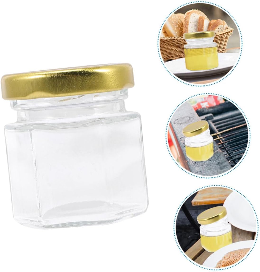 Package List x Jars Features -Material:Glass hexagon jars -Size:5.00X4.70X4.00cm/1.97X1.85X1.57in small honey bottles -Color:Transparent small honey jar -Capacity: 45ml sealed honey jars -This product uses materials, and , and can be used for a long time glass sealing jars. -Sealed with a lid, the product is light in weight, reusable, compact, and very convenient to use small glass jars. -The jar has a smooth surface and rounded edges, making it easy to clean and use household jam jars. -High durability and not easy to deform. Fine workmanship and texture practicality metal lid jam containers. -The traditional design of this honey jar is combined with the transparent design, highlighting your honey! jam storage bottlesGoods Descriptionsmall glass jars You can use it for honey, fish glue, bird's nest, jam, etc.glass sealing jars Made of glass materials, it is and to use.kitchen honey holder It is a suitable friends and family.household jam jars The sealed jar is a useful storage tool, which can keep your kitchen organized and your foodstuff fresh