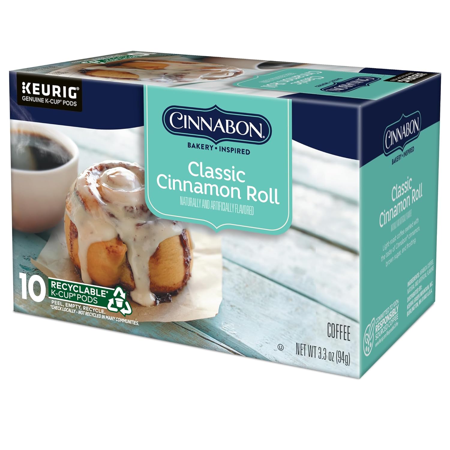 Cinnabon coffee has flavor that’ll have you flocking back for more. In every drop you can taste the superior quality of Arabica coffee beans, which gives our coffee a remarkably balanced taste. We've combined the indulgent taste and irresistible aroma of Cinnabon cinnamon rolls with the finest 100% Arabica coffee beans into a cup of delicious perfection. Go ahead and enjoy the extraordinary flavors of Cinnabon's world famous cinnamon rolls in the comfort of your own home, because you deserve it. We start with a smooth, light-roast brew and swirl in the decadent flavors of Cinnabon cinnamon, brown sugar, and, of course, our legendary frosting. Take a sip and delight in the taste of our world famous cinnamon rolls, hot out of the oven. Cinnabon Classic Cinnamon Roll is a cup of delicious perfection. Compatible with Keurig® K-Cup® pod single-serve coffee makers. Introducing Recyclable* K-Cup Pods: Simple. Delicious. And now Recyclable. Enjoy the same great-tasting coffee you know and love, and when you’re done just peel, empty and recycle. *Check locally, not recycled in all communities. Packaging may vary.