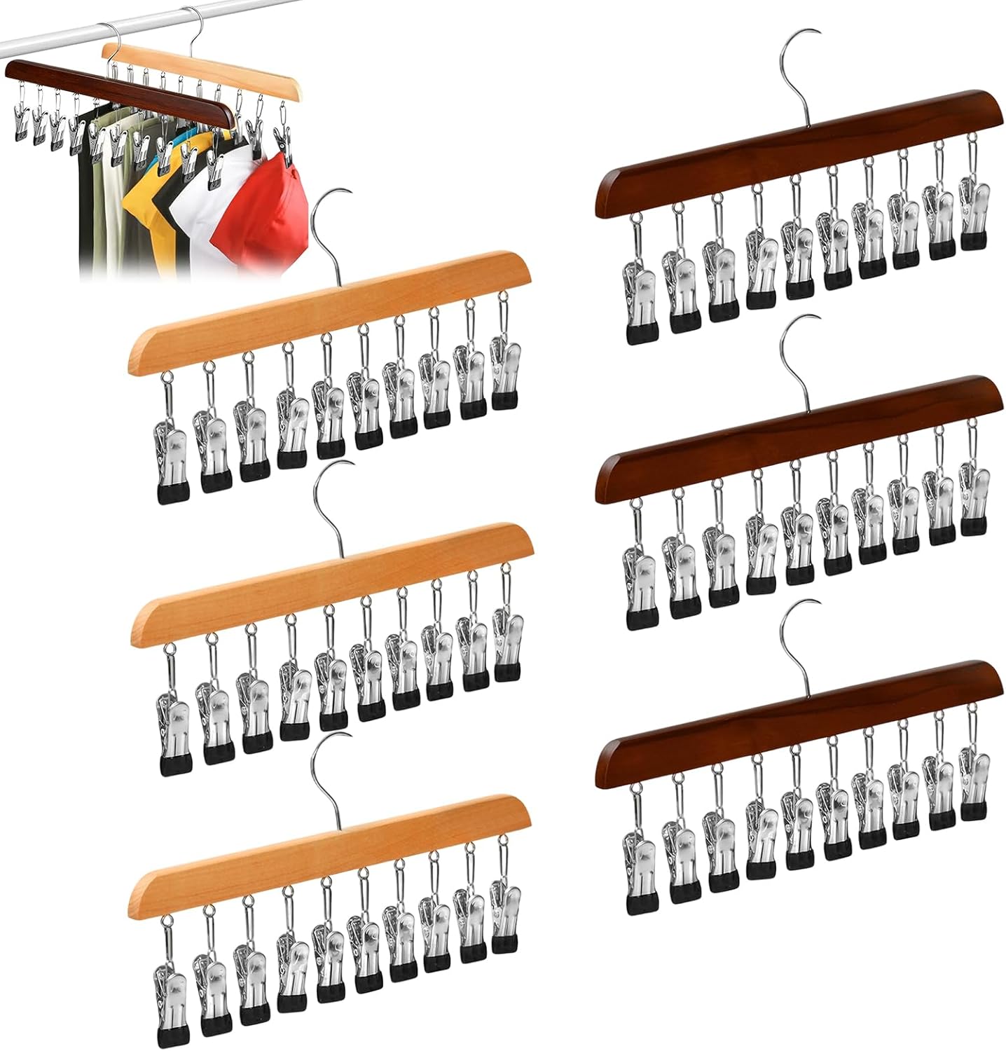 Specification Name: Closet Organizer with 10 Clips Size: 35*19cm/13.78*7.48in Material: Wood + Stainless Steel Packing List: 4/6/8/10 * Closet Organizer Note: 1.Due to manual measurements, please allow slight measurement deviations. 2.Due to the different display and lighting effects, the actual color of the item may be slightly different from the color displayed on the picture.