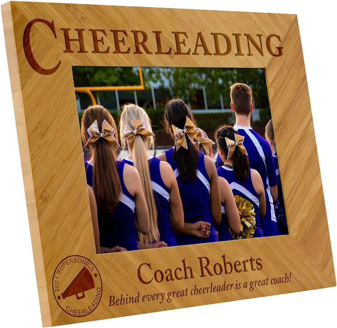 What better way to say thank you to your coach, than with our customizable 5 x 7" bamboo wood frame. Each frame can be personalized with your text and is themed for your sport. Choose from baseball, basketball, football, gymnastics, track and field, swimming, cheer, volleyball, or softball themed frames. Include your team name and custom thank you.
