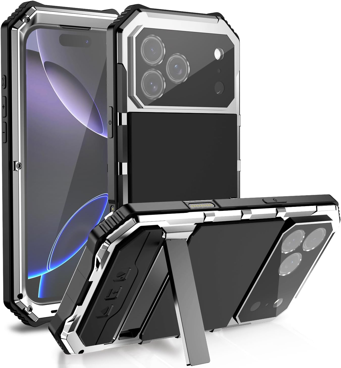 1. Top-Level Military-Grade Protection, Metal Heavy Armor: Compatible with iPhone 17 Pro, this heavy-duty metal case features a triple-layer protection structure—a shock-absorbing flexible silicone inner layer, front and rear reinforced aluminum alloy metal frames, and an integrated high-strength screen protector with an adjustable kickstand. The unique one-piece design preserves a metallic feel while providing all-around impact buffering. 2. Military-Grade Drop Test Certified, 10-Foot Drop Protection: Tested against MIL-STD-810G 516.6 military standards, the multi-layer design (TPU + aluminum alloy + tempered glass) withstands drops from up to 10 feet. Whether it’s an accidental bump or a fall from height, your phone remains unscathed with true 360° full-body protection. 3. Metal Multi-Function Kickstand, Horizontal and Vertical Freedom: The built-in metal kickstand supports stepless angle adjustment, allowing stable viewing in both landscape and portrait modes. Designed with a damping hinge, it stays securely in place and offers hands-free convenience for entertainment and work. 4. Gorilla-Glass Grade Screen + Sealed Camera Protection: Equipped with a built-in Gorilla-glass grade tempered glass screen protector offering 9H scratch resistance. The camera module is fully shielded by a metal frame and high-definition glass, protecting against dust, sand, snow, and shock—defending against all environmental hazards. 5. Designed for Outdoor Workers and Adventurers: Though slightly heavier (approx. 12 oz), this case is built for users who demand extreme protection. If you frequently work in high-risk environments (e.g., construction sites, field surveys, long-haul transport) or enjoy outdoor activities (cycling, hiking, camping), this metal armor will be your iPhone’s most reliable companion.