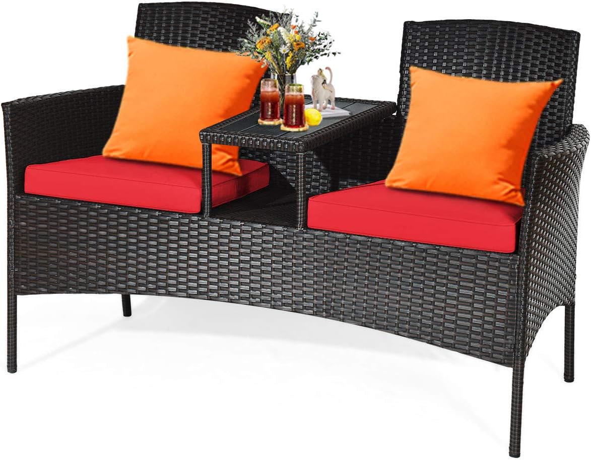 DescriptionEnjoy outdoor leisure time with this patio conversation set. Featuring rugged structure and high-quality PE rattan, this patio furniture set is built to stand up to harsh weather conditions and great for outdoor using. In addition, this patio loveseat set comes with a coffee table between 2 seats that provide enough space for books and cups. And this patio loveseat sofa set is more practical than traditional loveseat sofa and more space-saving than 3-piece patio furniture set. Besides, wide armrest and curved backrest ensures you will love the comfortable feel of the patio conversation. The thickly cushioned patio sofa set chairs for maximum comfort and excellent seating experience. By the way, this conversation is easy assembly.FeatureMade of high quality rattan with strong built-in frame structurePoly table top is durable and safe to useTrapezoid coffee table between two seats is practicalCozy thick cushions double your comfyThe cushion cover with zipper is removable and washableWide armrest and high curved backrest give you good supportNon-slip stable feet prevent scratching the floorModern style of unique design decor your roomEasy to assemble with instructionSpecificationColor: Mix BrownCushion Cover Color: BeigeOverall Dimension: 54.5"x24.0"x33.5" (L x W x H)Net Weight: 31 lbsWeight Capacity of Each Seat: 355 lbsTable Weight Capacity: 65 lbsPackage Include:1 x patio conversation set2 x cushions1 x instruction