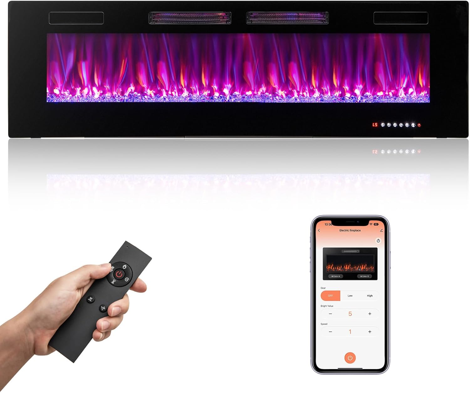 DescriptionThis ultra-thin electric fireplace will perfectly decorate your room and offer endless warmness to you. Featuring multi-color flame bed and flame, this electric fireplace will add a piece of elegance to the surroundings. There are three ways for you to control: control panel, remote control and smart APP control. You can connect the fireplace to your phone through Bluetooth or WIFI and use the Smart Life for more convenience. Apart from that, the fireplace is safe to use due to its ETL certification and overheat protection. FeatureBoth the flame and flame bed possess 12 different colors 5-level flame speed and 5-level brightness meet all your demands 3.19” ultra-thin thickness fits different kind of occasions Sparkling decorative crystals for more elegance Flame color and brightness will be auto-changed after pressing the COLOR for 6s Turn off all the lights by pressing the DIMMER for 6s Can be connected to the phone by WIFI or Bluetooth Control panel and remote control offer much convenience to operate 5,100 BTU heat output and 2 heating levels (750W/1500W) provide endless warmth Heating function and flame effect can be used independently Safe to operate with the ETL certification and overheat protection Quiet working and 12H timer for a better sleep Two installing ways: mounted or recessed SpecificationColor: Black Material: Steel, Tempered Glass Overall Dimension: 72” x 3.19” x 18.11” (L x W x H) Length of Power Cord: 6.5 ftNet Weight: 48 lbs Power: 750W/1500WVoltage: 120VFrequency: 60HzCoverage Area: 400 Sq. Ft AMP: 12.5AMP BTU: 5,100 BTU Package Includes: 1 x Electric Fireplace, 1 x Remote Control, 1 x Bag of Decorative Crystal, 1 x Instruction