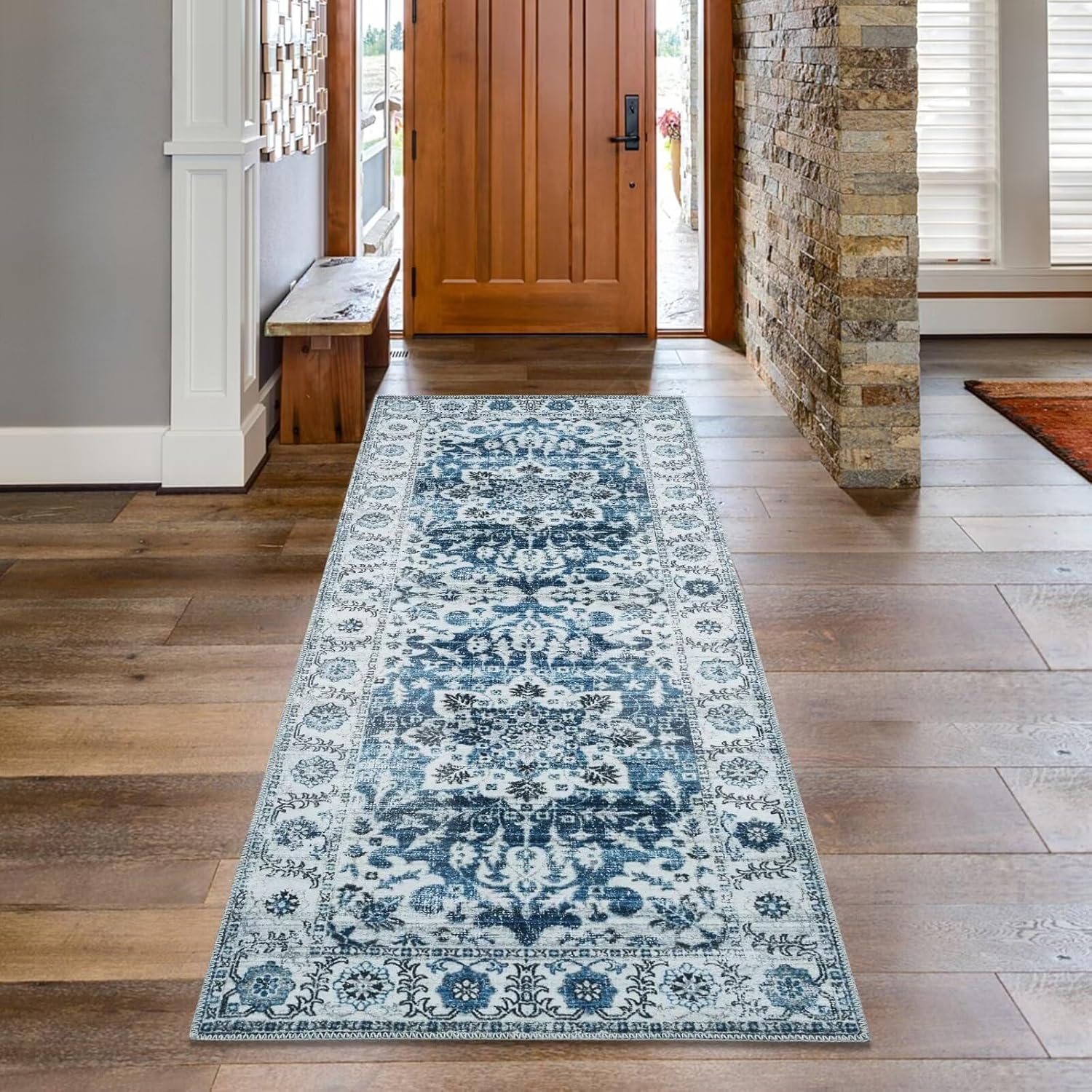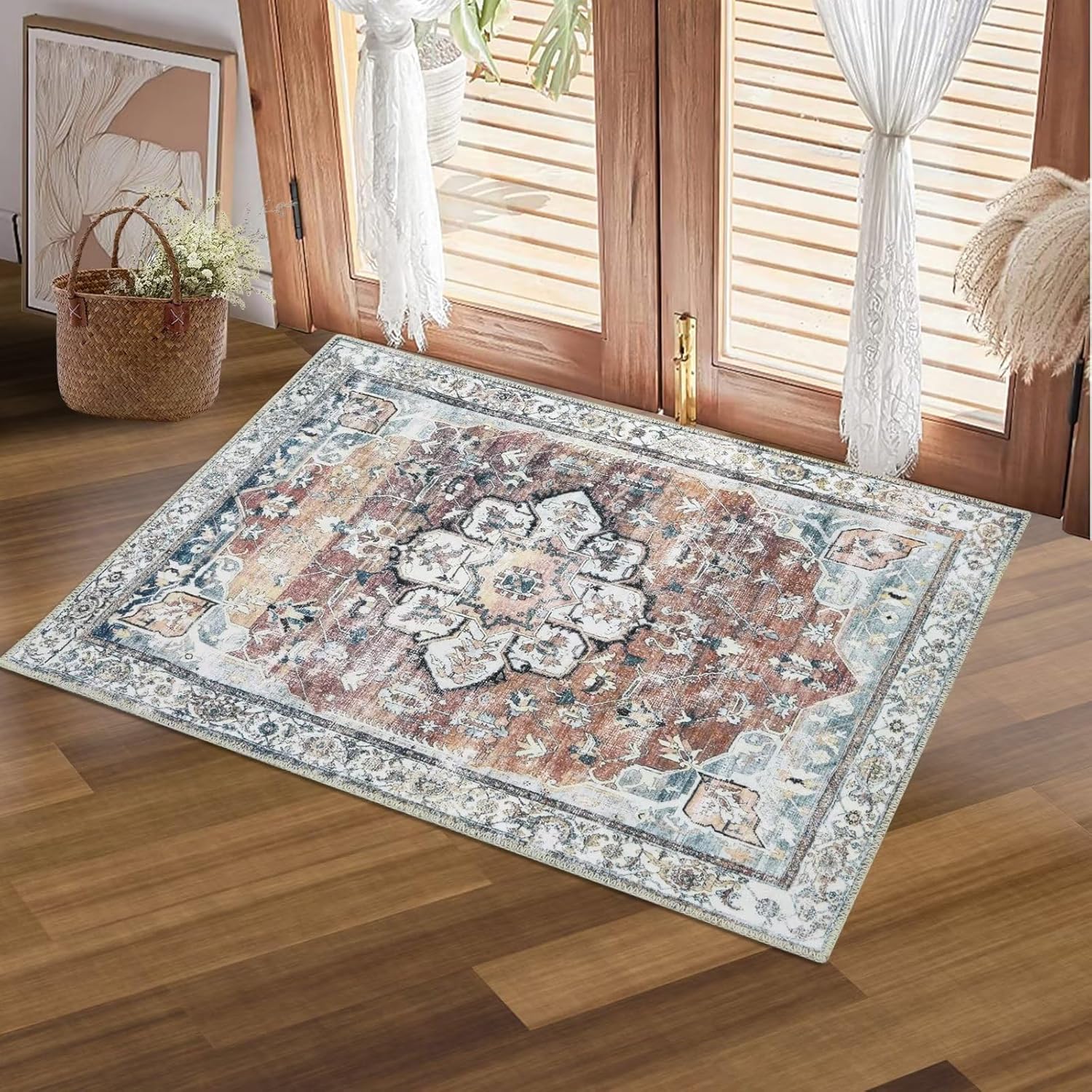 COZYLOOM 2x6 Vintage Runner Rug Medallion Distressed Accent Rug Aesthetic Boho Chenille Entryway Hallway Runners Low Pile Non-Slip Washable Rug Runner for Kitchen Laundry Green/Orange