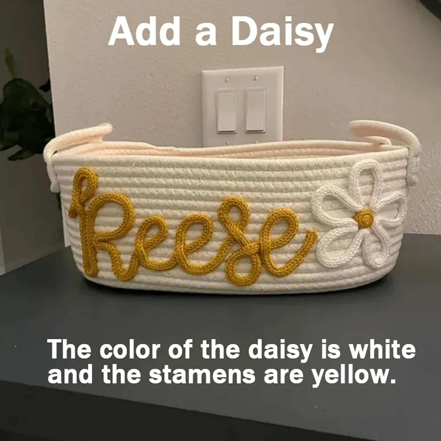 Details: Our custom rope baskets are the perfect for a baby shower gift that can double as storage for a nursery, kid's bedroom, playroom, etc. If you are adding a daisy, the color of the daisy is white and the stamens are yellow. The name is handmade and may be different from the picture. Hope you understand. Small - Approximately 12" x 8" x 4.5" (fits up to 7 letters) Medium - Approximately 13" x 9" x 5" (fits up to 8 letters) Large - Approximately 14" x 10" x 6.5" (fits up to 9 letters)