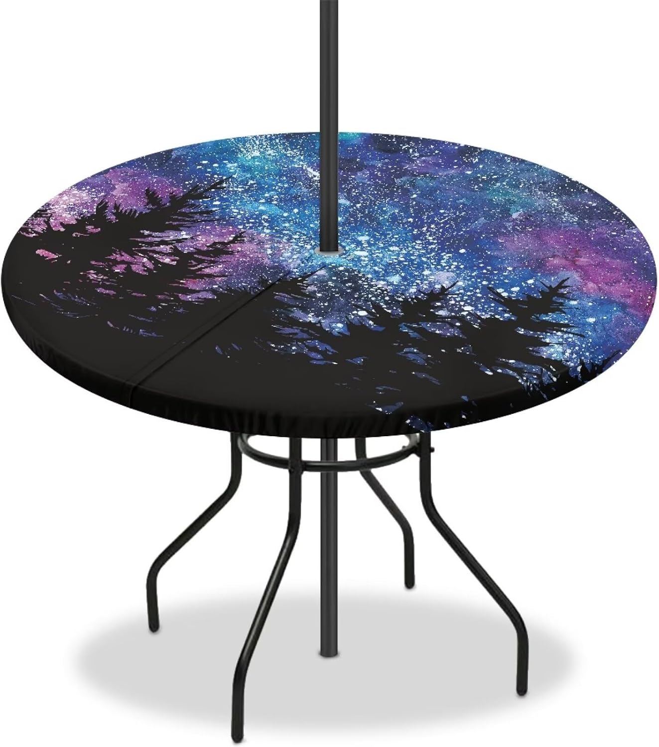 Basic Information Materia: waterproof polyester Size: fits coffee tables with a diameter of 45-61 inch Functional Features: Soft, comfy, waterproof, easy to wipe, foldable for easy storage Outdoor round table cover is elastic and stretchable, won't move or move easily, protect and decorate your afternoon tea table Round outdoor tablecloth with zipper and umbrella holes, easy to install and remove without removing the sunshade Hand washable or machine washable, air dry and reusable, still looks good after many washes, color will not fade easily Perfect for outdoor garden, patio, beach, bar, camping, family gatherings and picnics, as a perfect gift for yourself, your spouse, relatives and friends on Christmas, New Year, housewarming, birthdays and other special holidays