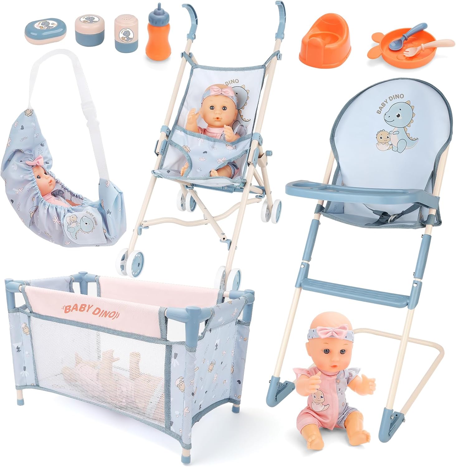 | Included Components | 2-in-1 Storage Bag, Baby Doll Figure, Baby Doll Stroller, Dinosaur Figure, Doll Crib, Feeding Accessories Bottle, High Chair, Potty Trainer, Tableware Toys |