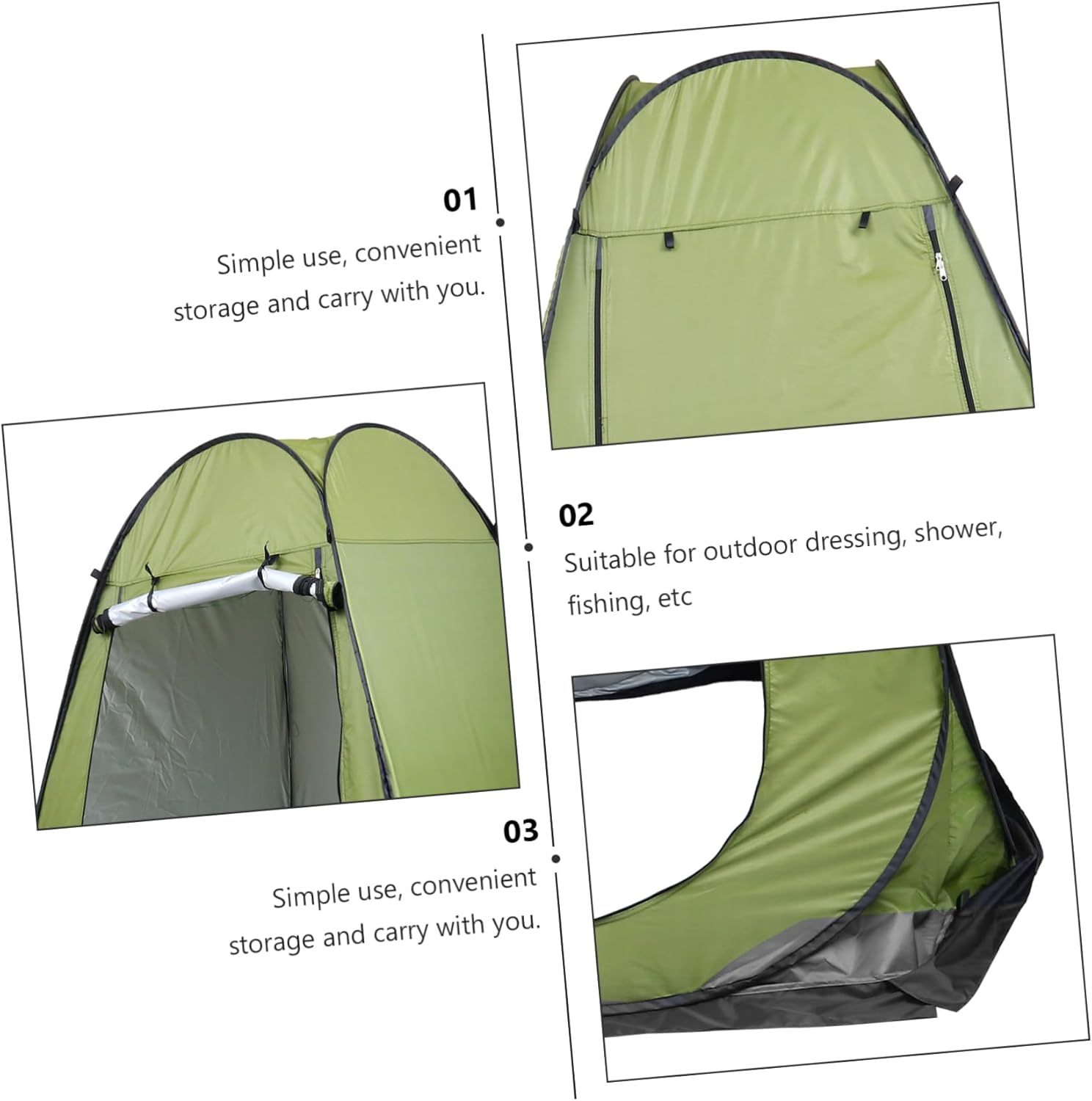 Package List 1 x Storage bag 4 x nail 4 x windproof rope 1 Features -Material:Oxford,-steel and polyester movable tent -Size:190.00X150.00X150.00cm/74.67X58.95X58.95in Automatic Changing Clothes Tent -Large enough to be used as dressing, shower or toilet room camping tent. -It's and convenient, and strong in functionality beach tent. -It can be used for changing clothes, bathing, makeshift toilets, or wherever privacy is needed Fishing Tent. -Light weight and portable design for convenient storage and carrying automatic tent. -It is manufactured with top-class material for and use Portable Bathing Tent.Goods DescriptionAutomatic Camping Tent need a outdoor camping tent? If so, take a quick look at this outdoor changing clothes tent.beach tent Unique design and craftsmanship ensure its popularity and practicality.Privacy Shower Tent Made of materials, and