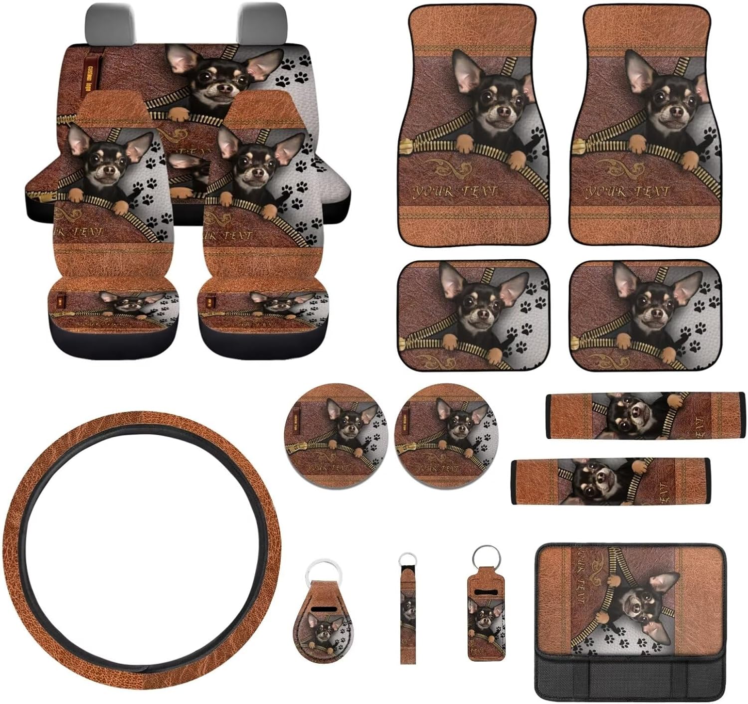 17-piece car seat covers & accessories set, a must-have for enhancing both the comfort and style of your car's interior. What will you get: -4 pieces car seat covers -4 piece car floor mats -1 car steering wheel cover -1 center console pad -2 piece seat belt pads -2 piece water cup coasters -2 piece different keychains -1 chapstick holder Designed for easy installation and a universal fit, our car seat cover sets are suitable for SUVs, sedans, trucks and van. Made from high-quality polyester fabric and neoprene, these automotive accessories are soft and breathable. The stretchy fabric shows the patterns beautifully and will not fade, adding a touch of elegance to your car's interior. With these stylish and functional decorations, you can protect your car seats while enjoying a comfortable and enjoyable driving experience. Customized Services: Unleash your creativity! We offer customized services to bring your vision to life. Share your picture or text with us, and our team will create a one-of-a-kind product just for you! Washing method: Our products can be handwashed. Do not soak for a long time, do not bleach, and the temperature should not exceed 45ºC Note: -Please refer to the product images for proper sizing before purchase. -If you notice any initial odor, simply place the product in a well-ventilated area for a short time, and it will dissipate. -Please allow a little error in the size (usually 1 to 2 cm) due to different measures. -Please allow a little difference of the color due to different light or environment or production batch and machinery.