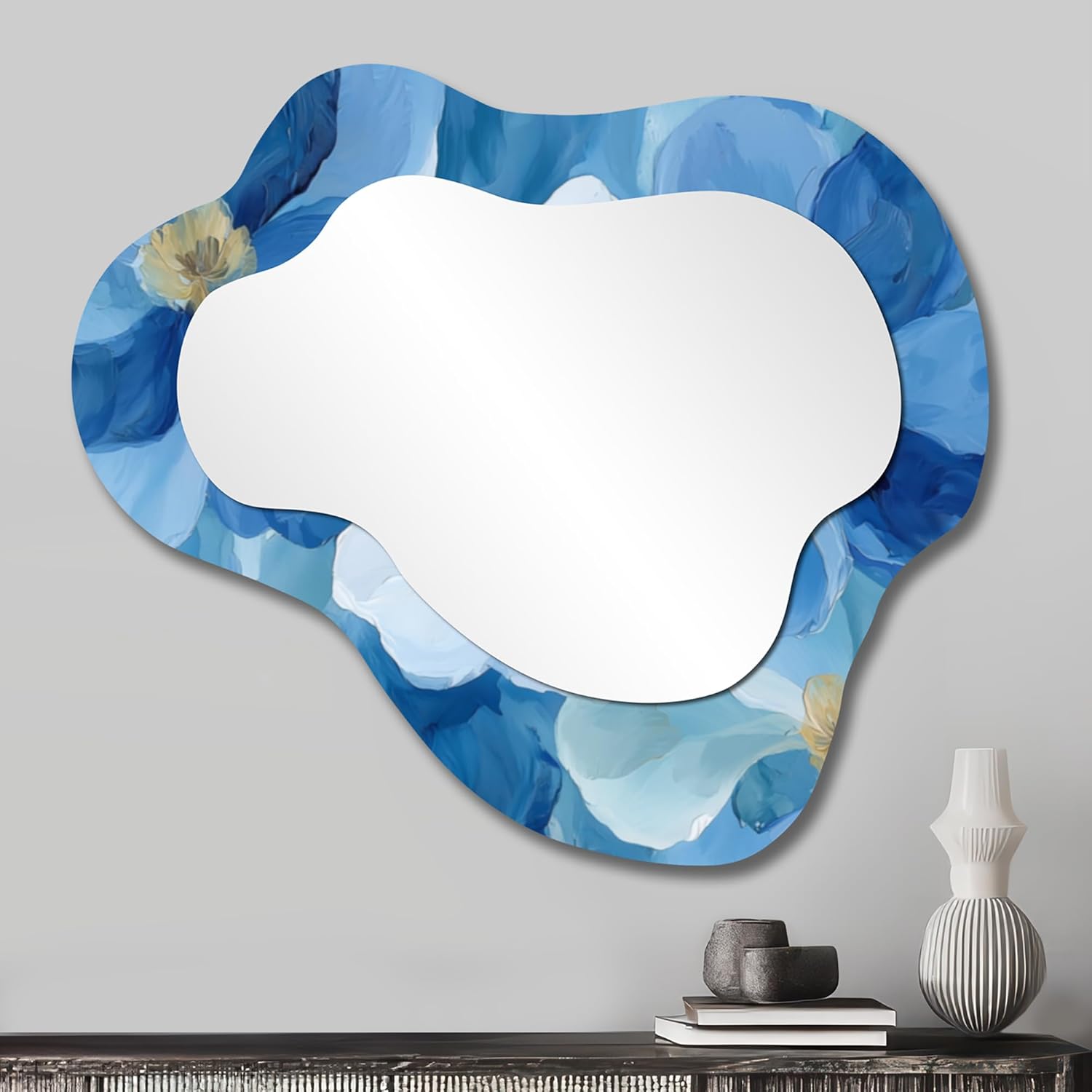 Add delicate floral elegance with this cloud shaped decorative mirror showcasing dogwood petals in yellow and blue. Its reflective surface brightens interiors and expands space. Ideal for bedrooms, living rooms, or hallways.