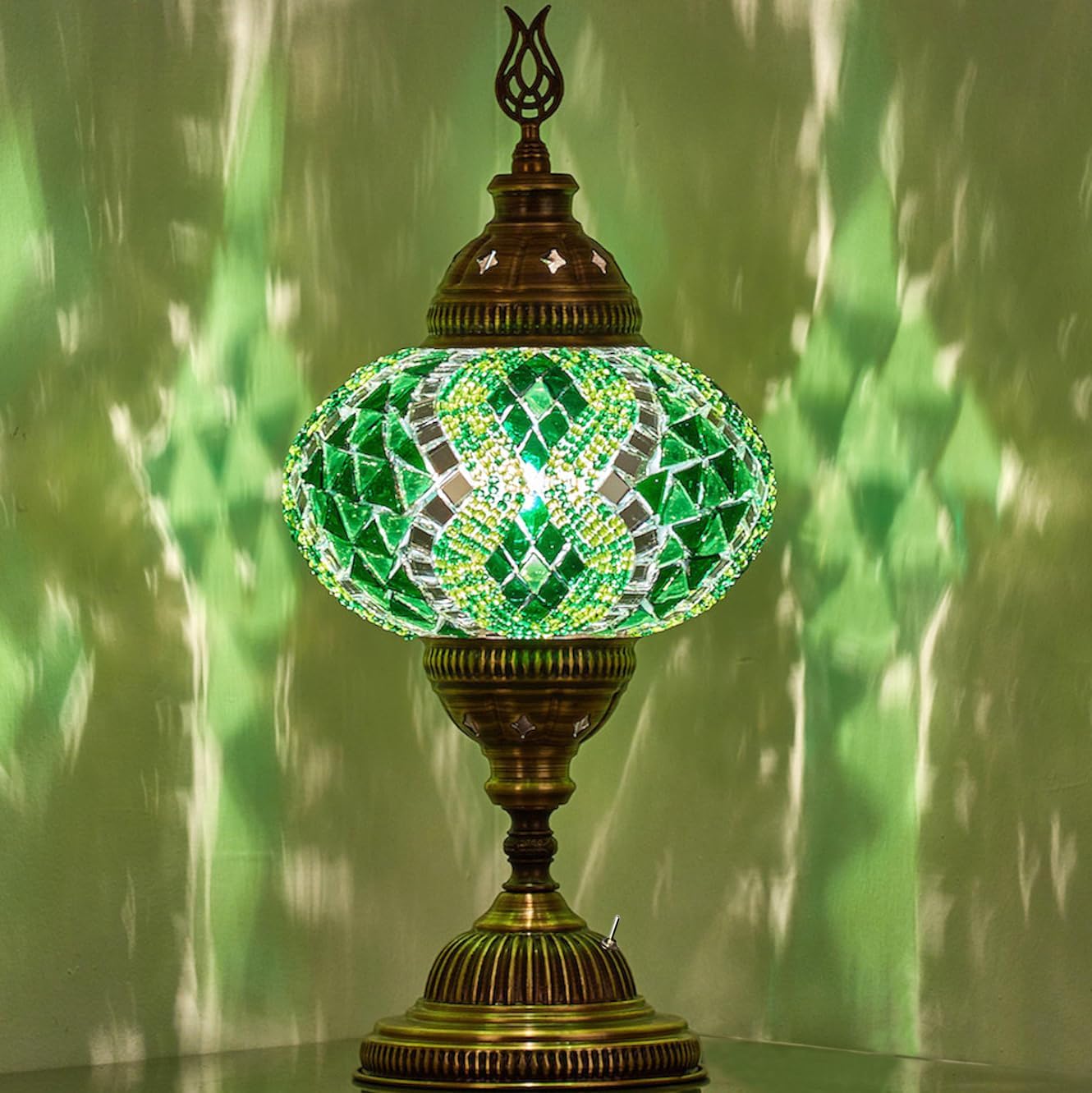 Turkish Moroccan Mosaic Table Bedside Mood Accent Night Lamp.No Cord. Works with 2 AA Batteries.(Not Included). Built-In LED Bulb. Low Light.Totally Handmade in Turkey. Hand Cut Glass Pieces & Glass Beads Pasted on Globes.Antique Brass Color Decorated Metal Body. Top Finial. On/Off Switch.