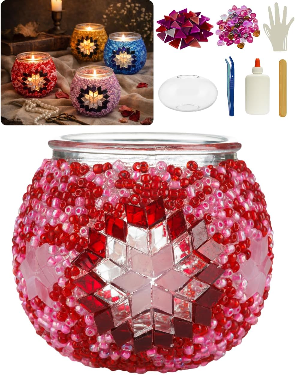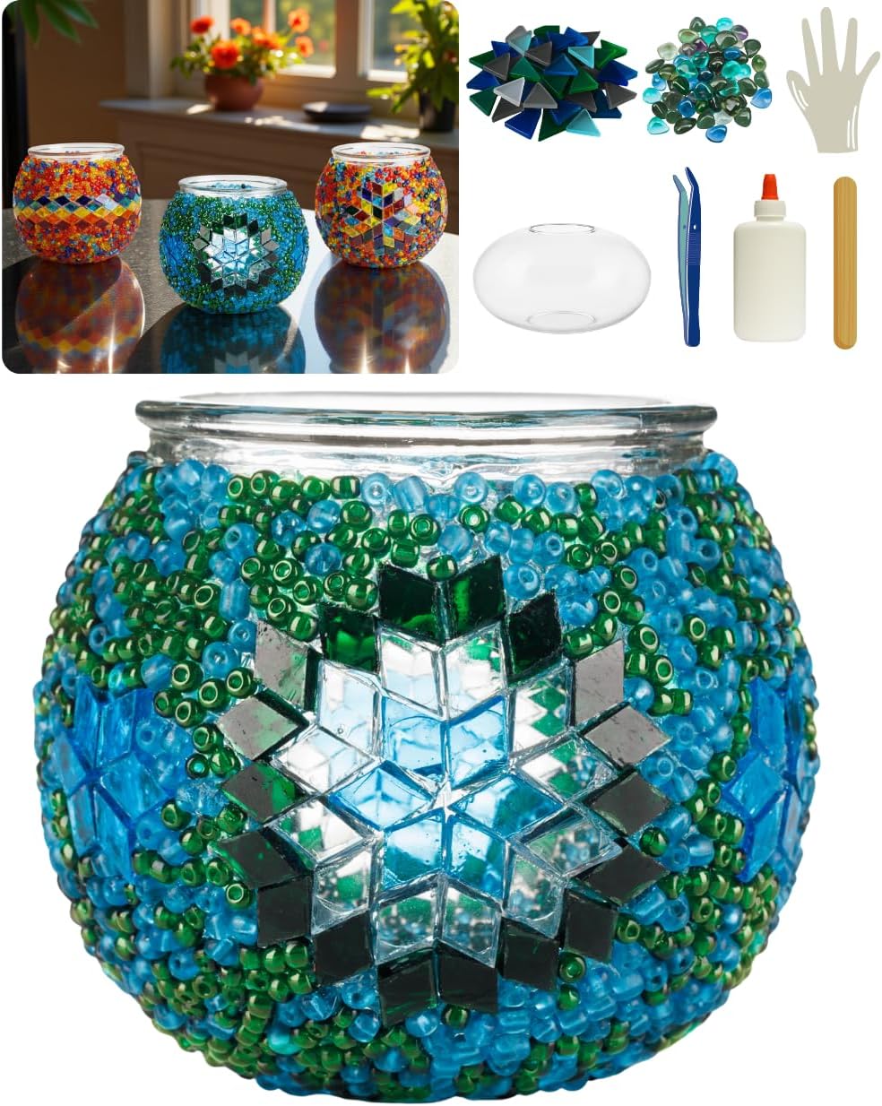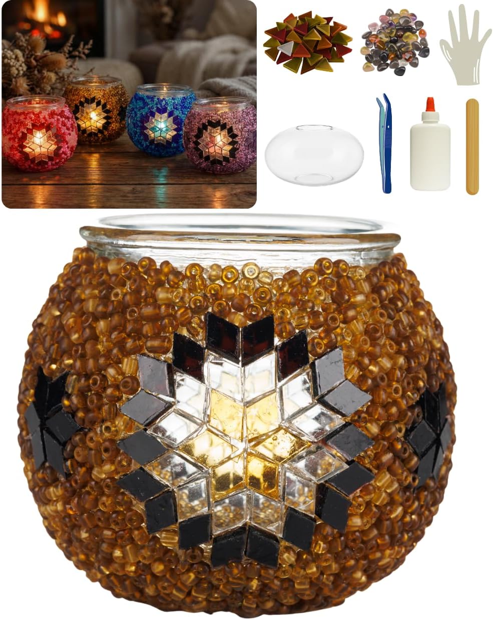 Transform your space with this enchanting DIY Turkish Mosaic Candle Holder Kit from DEMMEX. Perfect for beginners, this complete craft project requires no grout or plaster, making it an ideal creative activity for both adults and teens. The comprehensive kit includes everything you need: a glass candle holder base, colorful mosaic glass pieces, decorative glass beads, adhesive, tweezers, and a craft stick. For your convenience, the kit comes with protective gloves and a design template to guide your creative process. The detailed instruction guide walks you through each step, helping you create a stunning piece of functional art. Once completed, this handcrafted mosaic candle holder adds a touch of Turkish-inspired elegance to any room, casting beautiful light patterns when illuminated. Whether you're looking for a rewarding creative project or a unique decorative accent, this mosaic kit offers both artistic satisfaction and stunning results.