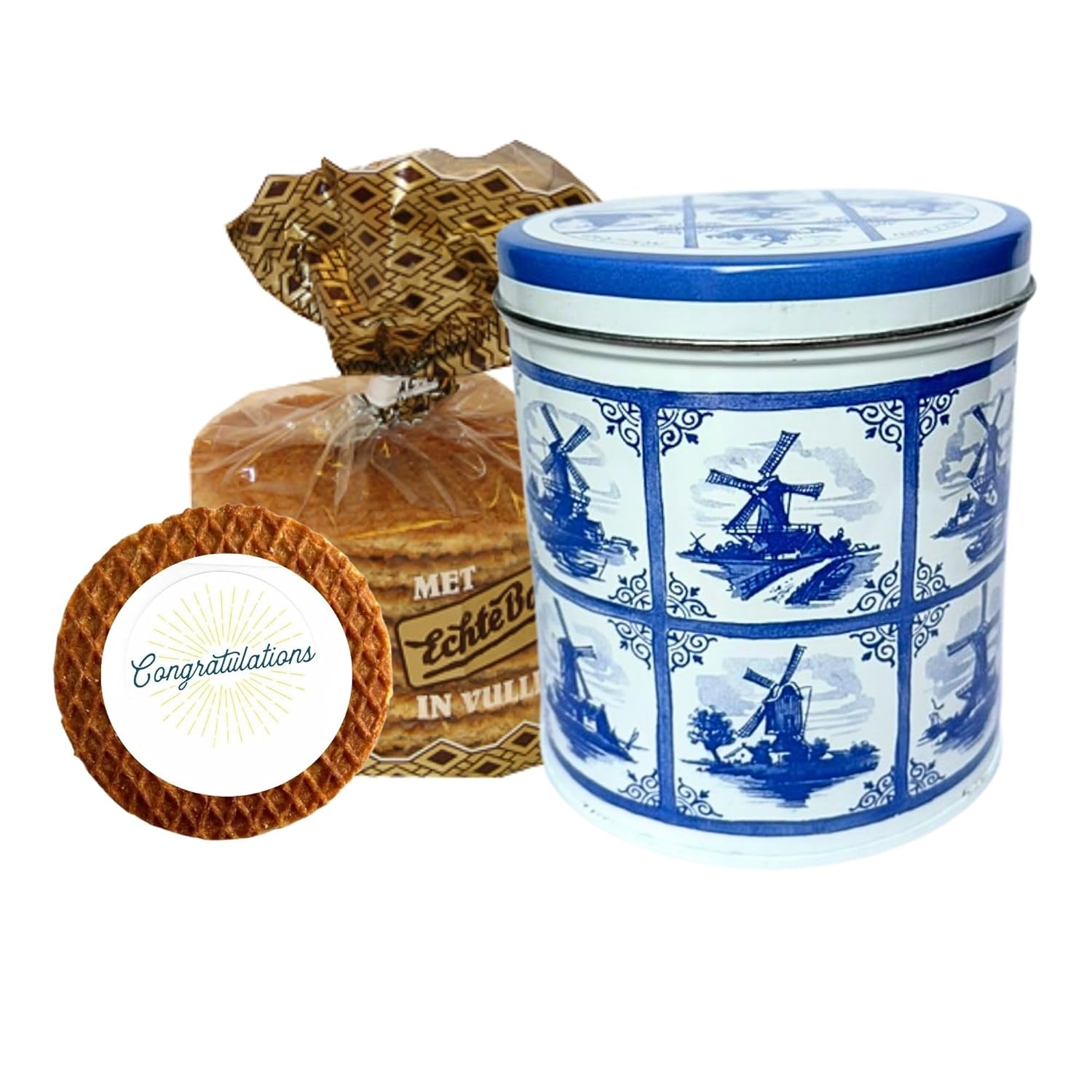 Experience the authentic delight of Dutch stroopwafels, a timeless treat hailing from the heart of Amsterdam. This premium stroopwafel caramel gift set includes 8 caramel waffles, each featuring a crispy, buttery wafer filled with a rich, caramel center that melts in your mouth. Presented in a stunning Dutch-printed tin adorned with iconic Amsterdam and Holland imagery, this set is ideal for gifting or indulging yourself. Each stroupe waffle gift set comes with one individually wrapped stroopwafel with a custom gift message—choose from Happy Birthday, Happy Father's Day, or Thinking of You—Get Well Soon, Congratulations and Thank You- to add a warm, thoughtful touch for holidays or special occasions. This stroopwaffle gift set is designed for both practicality and elegance. The reusable tin not only preserves the freshness of the caramel waffles but also serves as a charming keepsake, perfect for storing small treasures or displaying as a decorative piece. The wrapped stroopwafels ensure convenience and portability, allowing you to enjoy Dutch tradition anywhere. These waffles are more than just a sweet thin or stroop chip; they offer a substantial, satisfying texture that’s both crispy and chewy, making them a standout choice for dessert or a coffee break.